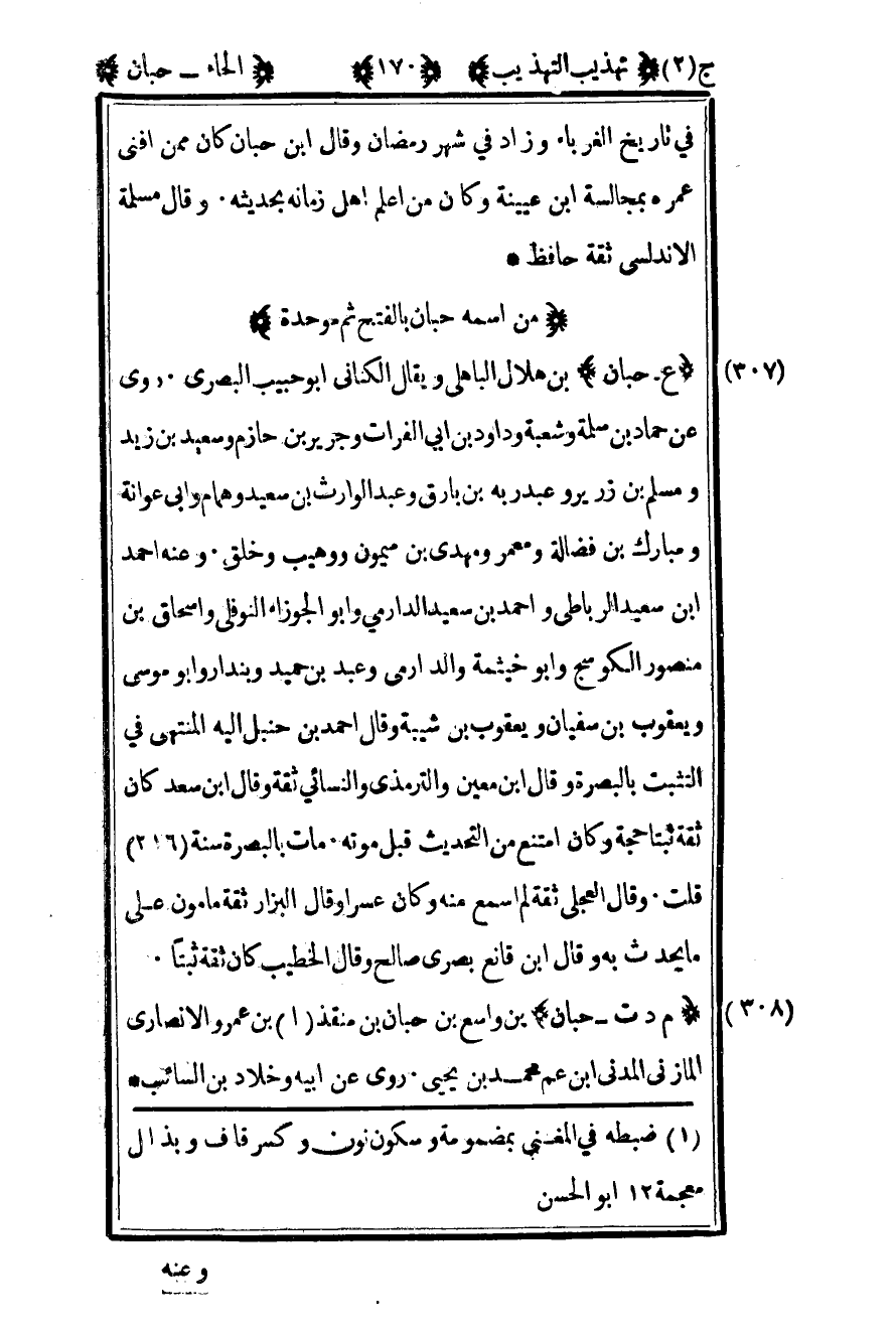 307- "ع – حبان" بن هلال الباهلي ويقال الكناني أبو حبيب البصري روى عن حماد بن سلمة وشعبة وداود بن أبي الفرات وجرير بن حازم وسعيد بن زيد ومسلم بن زرير وعبد ربه بن بارق وعبد الوارث بن سعيد وهمام وأبي عوانة ومبارك بن فضالة ومعمر ومهدي بن ميمون ووهيب وخلق وعنه أحمد بن سعيد الرباطي وأحمد بن سعيد الدارمي وأبو الجوزاء النوفلي وإسحاق بن منصور الكوسج وأبو خيثمة والدارمي وعبد بن حميد وبندار وأبو موسى ويعقوب بن سفيان ويعقوب بن شيبة وقال أحمد بن حنبل إليه المنتهى في التثبت بالبصرة وقال بن معين والترمذي والنسائي ثقة وقال بن سعد كان ثقة ثبتا حجة وكان أمتنع من التحديث قبل موته مات بالبصرة سنة "216". قلت: وقال العجلي ثقة لم أسمع منه وكان عسرا وقال البزار ثقة مأمون على ما يحدث به وقال بن قانع بصري صالح وقال الخطيب كان ثقة ثبتا.