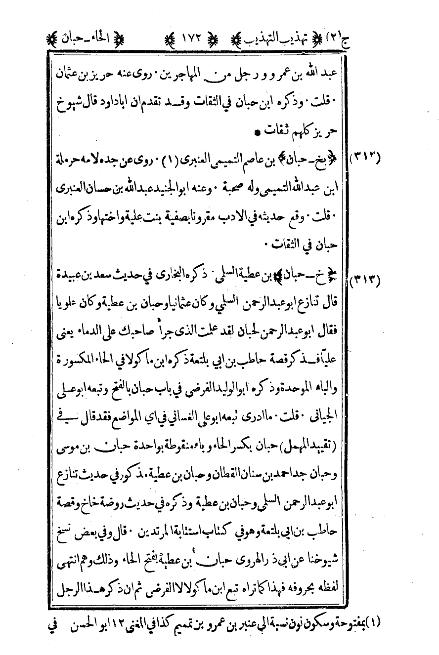 312- "بخ – حبان" بن عاصم التميمي العنبري1 روى عن جده لأمه حرملة بن عبد الله التميمي وله صحبة وعنه أبو الجنيد عبد الله بن حسان العنبري قلت وقع حديثه في الأدب مقرونا بصفية بنت علية وأختها وذكره بن حبان في الثقات.