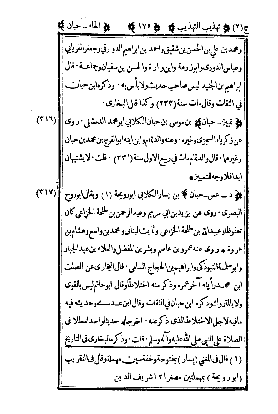 316- "تمييز- حبان" بن موسى بن حبان الكلابي أبو محمد الدمشقي روى عن زكريا السجزي وغيره وعنه والد تمام وابن ابنه أبو الفرج بن محمد بن حبان وغيرهما قال والد تمام مات في ربيع الأول سنة "331". قلت: لا يشتبهان أبدا فلا وجه للتمييز.