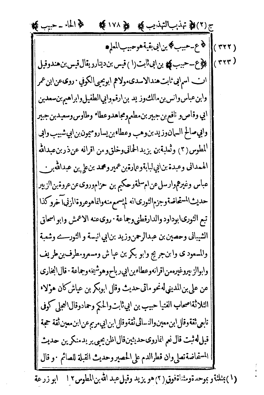 323- "ع – حبيب" بن أبي ثابت1 قيس بن دينار ويقال قيس بن هند وقيل إن اسم أبي ثابت هند الأسدي مولاهم أبو يحيى الكوفي روى عن بن عمر وابن عباس وأنس بن مالك وزيد بن أرقم وأبي الطفيل وإبراهيم بن سعد بن أبي وقاص ونافع بن جبير بن مطعم ومجاهد وعطاء وطاوس وسعيد بن جبير وأبي صالح السمان وزيد بن وهب وعطاء بن يسار وميمون بن أبي شبيب وأبي المطوس2 وثعلبة بن يزيد الحماني وخلق ومن أقرانه عن ذر بن عبد الله الهمداني وعبدة بن أبي لبابة وعمارة بن عمير ومحمد بن علي بن عبد الله بن عباس وغيرهم وأرسل عن أم سلمة وحكيم بن حزام وروى عن عروة بن الزبير حديث المستحاضة وجزم الثوري أنه لم يسمع منه وإنما هو عروة المزني آخر وكذا تبع الثوري أبو داود والدارقطني وجماعة روى عنه الأعمش وأبو إسحاق الشيباني وحصين بن عبد الرحمن وزيد بن أبي أنيسة والثوري وشعبة والمسعودي وابن جريج وأبو بكر بن عياش ومسعر ومطرف بن طريف وأبو الزبير وغيره من أقرانه وعطاء بن أبي رباح وهو شيخه وجماعة قال البخاري عن علي بن المديني له نحو مائتي حديث وقال أبو بكر بن عياش كان هؤلاء الثلاثة أصحاب الفتيا حبيب بن أبي ثابت والحكم وحماد وقال العجلي كوفي تابعي ثقة وقال بن معين والنسائي ثقة وقال بن أبي مريم عن بن معين ثقة حجة قيل له ثبت قال نعم إنما روى حديثين قال أظن يحيى يريد منكرين حديث المستحاضة تصلي وإن قطر الدم على الحصير وحديث القبلة للصائم. وقال