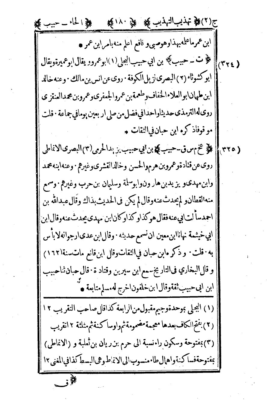 325- "عخ م س ق – حبيب" بن أبي حبيب يزيد الحرمي3 البصري الأنماطي روى عن قتادة وعمرو بن هرم والحسن وخالد القشري وغيرهم وعنه ابنه محمد وابن مهدي ويزيد بن هارون وأبو سلمة وسليمان بن حرب وغيرهم وسمع منه القطان ولم يحدث عنه وقال لم يكن في الحديث بذاك وقال عبد الله بن أحمد سألت أبي عنه فقال هو كذا وكذا وكان بن مهدي يحدث عنه وقال بن أبي خيثمة نهانا بن معين أن نسمع حديثه وقال بن عدي أرجو أنه لا بأس به قلت وذكره بن حبان في الثقات وقال بن قانع مات سنة "162" وقال البخاري في التاريخ سمع بن سيرين وقتادة قال حبان ثنا حبيب بن أبي حبيب ثقة وقال بن خلفون أخرج له مسلم متابعة.
