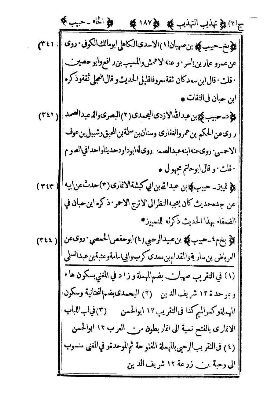 341- "بخ – حبيب" بن صهبان1 الأسدي الكاهلي أبو مالك الكوفي روى عن عمر وعمار بن ياسر وعنه الأعمش والمسيب بن رافع وأبو حصين قلت قال بن سعد كان ثقة معروفا قليل الحديث وقال العجلي ثقة وذكره بن حبان في الثقات.