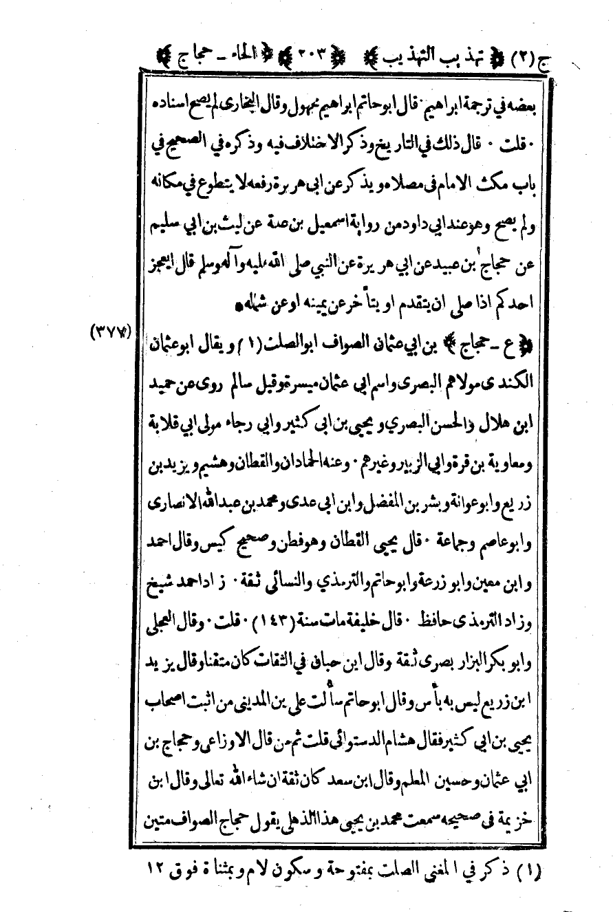 377- "ع – حجاج" بن أبي عثمان الصواف أبو الصلت1 ويقال أبو عثمان الكندي مولاهم البصري واسم أبي عثمان ميسرة وقيل سالم روى عن حميد بن هلال والحسن البصري ويحيى بن أبي كثير وأبي رجاء مولى أبي قلابة ومعاوية بن قرة وأبي الزبير وغيرهم وعنه الحمادان والقطان وهشيم ويزيد بن زريع وأبو عوانة وبشر بن المفضل وابن أبي عدي ومحمد بن عبد الله الأنصاري وأبو عاصم وجماعة قال يحيى القطان وهو فطن وصحيح كيس وقال أحمد وابن معين وأبو زرعة وأبو حاتم والترمذي والنسائي زاد أحمد شيخ وزاد الترمذي حافظ قال خليفة مات سنة "143" قلت وقال العجلي وأبو بكر البزار بصري ثقة وقال بن حبان في الثقات كان متقنا وقال يزيد بن زريع ليس به بأس وقال أبو حاتم سألت علي بن المديني من أثبت أصحاب يحيى بن أبي كثير فقال هشام الدستوائي قلت ثم من قال الأوزاعي وحجاج بن أبي عثمان وحسين المعلم وقال بن سعد كان ثقة إن شاء الله تعالى وقال بن خزيمة في صحيحه سمعت محمد بن يحيى هذا الذهلي يقول حجاج الصواف متين
