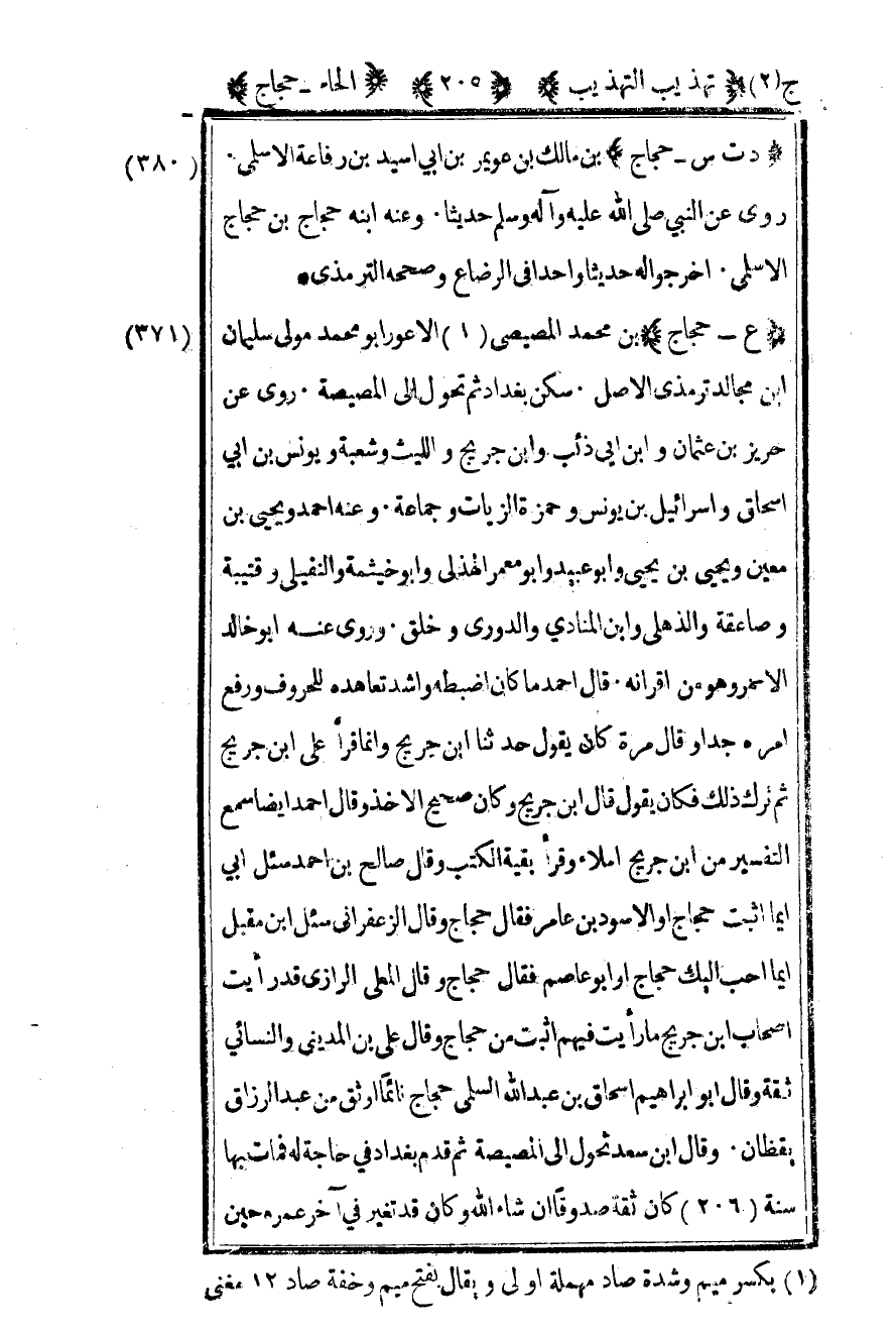 381- "ع – حجاج" بن محمد المصيصي1 الأعور أبو محمد مولى سليمان بن مجالد ترمذي الأصل سكن بغداد ثم تحول إلى المصيصة روى عن حريز بن عثمان وابن أبي ذئب وابن جريج والليث وشعبة ويونس بن أبي إسحاق وإسرائيل بن يونس وحمزة الزيات وجماعة وعنه أحمد ويحيى بن معين ويحيى بن يحيى وأبو عبيد وأبو معمر الهذلي وأبو خيثمة والنفيلي وقتيبة وصاعقة والذهلي وابن المنادى والدوري وخلق وروى عنه أبو خالد الأحمر وهو من أقرانه قال أحمد ما كان أضبطه وأشد تعاهده للحروف ورفع أمره جدا وقال مرة كان يقول حدثنا بن جريج وإنما قرأ على بن جريج ثم ترك ذلك فكان يقول قال بن جريج وكان صحيح الأخذ وقال أحمد أيضا سمع التفسير من بن جريج أملاء وقرأ بقية الكتب وقال صالح بن أحمد سئل أبي أيما أثبت حجاج أو الأسود بن عامر فقال حجاج وقال الزعفراني سئل بن مقبل أيما أحب إليك حجاج أو أبو عاصم فقال حجاج وقال المعلى الرازي قد رأيت أصحاب بن جريج ما رأيت فيهم أثبت من حجاج وقال علي بن المديني والنسائي ثقة وقال أبو إبراهيم إسحاق بن عبد الله السلمي حجاج نائما أوثق من عبد الرزاق يقظان وقال بن سعد تحول إلى المصيصة ثم قدم بغداد في حاجة له فمات بها سنة "206" كان ثقة صدوقا إن شاء الله وكان قد تغير في آخر عمره حين