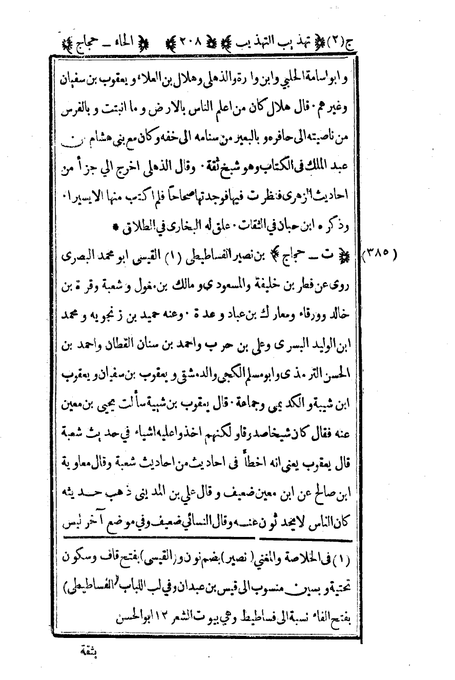 385 - "ت – حجاج" بن نصير الفساطيطي1 القيسي أبو محمد البصري روى عن فطر بن خليفة والمسعودي ومالك بن مغول وشعبة وقره بن خالد وورقاء ومعارك بن عبادة وعدة وعنه حميد بن زنجويه ومحمد بن الوليد البسري وعلي بن حرب وأحمد بن سنان القطان وأحمد بن الحسن الترمذي وأبو مسلم الكجي والدمشقي ويعقوب بن سفيان ويعقوب بن شيبة والكديمي وجماعة قال يعقوب بن شيبة سألت يحيى بن معين عنه فقال كان شيخا صدوقا ولكنهم أخذوا عليه أشياء في حديث شعبة قال يعقوب يعني أنه أخطأ في أحاديث من أحاديث شعبة وقال معاوية بن صالح عن بن معين ضعيف وقال علي بن المديني ذهب حديثه كان الناس لا يحدثون عنه وقال النسائي ضعيف وفي موضع آخر ليس