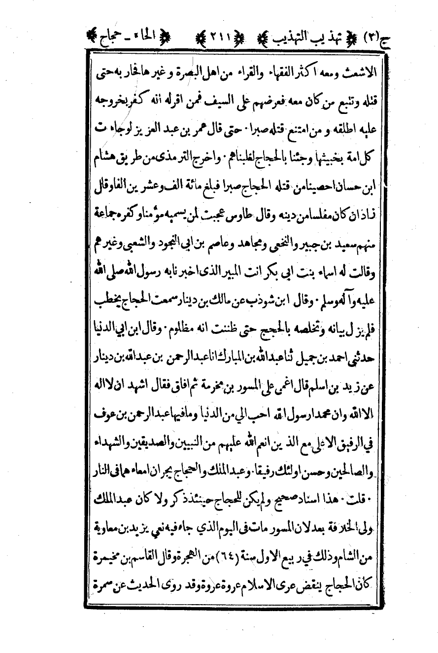 الأشعث ومعه أكثر الفقهاء والقراء من أهل البصرة وغيرها فحاربه حتى قتله وتتبع من كان معه فعرضهم على السيف فمن أقر له أنه كفر بخروجه عليه أطلقه ومن امتنع قتله صبرا حتى قال عمر بن عبد العزيز لو جاءت كل أمة بخبيثها وجئنا بالحجاج لغلبناهم وأخرج الترمذي من طريق هشام بن حسان أحصينا من قتله الحجاج صبرا فبلغ مائة ألف وعشرين ألفا وقال زاذان كان مفلسا من دينه وقال طاوس عجبت لمن يسميه مؤمنا وكفره جماعة منهم سعيد بن جبير والنخعي ومجاهد وعاصم بن أبي النجود والشعبي وغيرهم. وقالت له أسماء بنت أبي بكر أنت المبير الذي أخبرنا به رسول الله صلى الله عليه وسلم وقال بن شوذب عن مالك بن دينار سمعت الحجاج يخطب فلم يزل بيانه وتخلصه بالحجج حتى ظننت أنه مظلوم وقال بن أبي الدنيا حدثني أحمد بن جميل ثنا عبد الله بن المبارك أنا عبد الرحمن بن عبد الله بن دينار عن زيد بن أسلم قال أغمي على المسور بن مخرمة ثم أفاق فقال أشهد أن لا إله إلا الله وأن محمدا رسول الله أحب إلي من الدنيا وما فيها عبد الرحمن بن عوف في الرفيق الأعلى مع الذين أنعم الله عليهم من النبيين والصديقين والشهداء والصالحين وحسن أولئك رفيقا وعبد الملك والحجاج يجران أمعاءهما في النار قلت هذا إسناد صحيح ولم يكن للحاج حينئذ ذكر ولا كان عبد الملك ولي الخلافة بعد لأن المسور مات في اليوم الذي جاء فيه نعي يزيد بن معاوية من الشام وذلك في ربيع الأول سنة "64" من الهجرة وقال القاسم بن مخيمرة كان الحجاج ينقض عرى الإسلام عروة عروة وقد روى الحديث عن سمرة