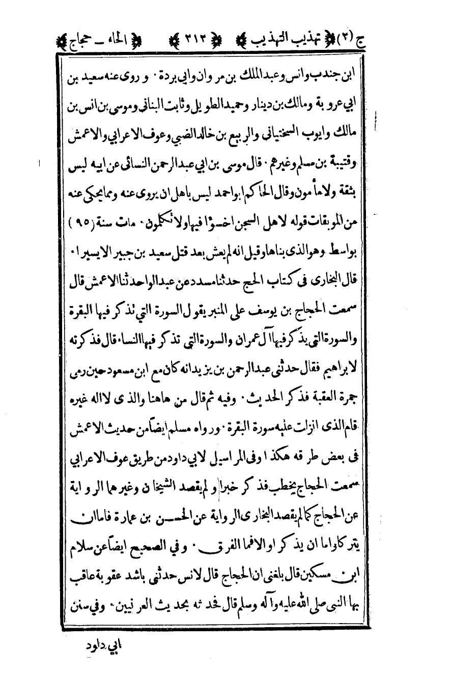 قال البخاري في كتاب الحج حدثنا مسدد عن عبد الواحد ثنا الأعمش قال سمعت الحجاج بن يوسف على المنبر يقول السورة التي تذكرها فيها البقرة والسورة التي يذكر فيها آل عمران والسورة التي تذكر فيها النساء قال فذكرته لإبراهيم فقال حدثني عبد الرحمن بن يزيد أنه كان مع بن مسعود حين رمى جمرة العقبة فذكر الحديث وفيه ثم قال من ها هنا والذي لا إله غيره قام الذي أنزلت عليه سورة البقرة ورواه مسلم أيضا من حديث الأعمش في بعض طرقه هكذا وفي المراسيل لأبي داود من طريق عوف الأعرابي سمعت الحجاج يخطب فذكر خبرا ولم يقصد الشيخان وغيرهما الرواية عن الحجاج كما لم يقصد البخاري الرواية عن الحسن بن عمارة فأما أن يتركا وأما أن يذكرا وإلا فما الفرق وفي الصحيح أيضا عن سلام بن مسكين قال بلغني أن الحجاج قال لأنس حدثني بأشد عقوبة عاقب بها النبي صلى الله عليه وسلم قال فحدثه بحديث العرنيين وفي سنن
