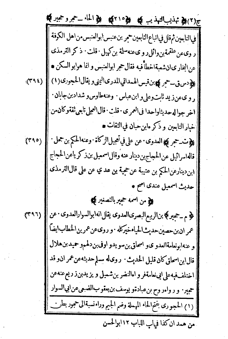 394- "د س ق – حجر" بن قيس الهمداني اليمني ويقال الحجوري1 روى عن زيد بن ثابت وعلي وابن عباس وعنه طاوس وشداد بن جابان. أخرجوا له حديثا واحدا في العمري قلت قال العجلي تابعي ثقة وكان من خيار التابعين وذكره بن حبان في الثقات.