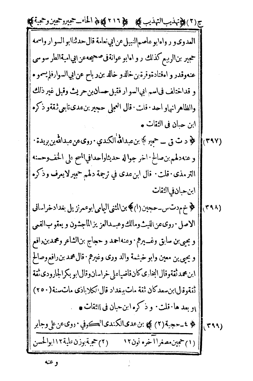 397- "د ت ق – حجير" بن عبد الله الكندي روى عن عبد الله بن بريدة وعنه دلهم بن صالح أخرجوا له حديثا واحدا في المسح على الخف وحسنه الترمذي. قلت: قال بن عدي في ترجمة دلهم حجير لا يعرف وذكره بن حبان في الثقات.