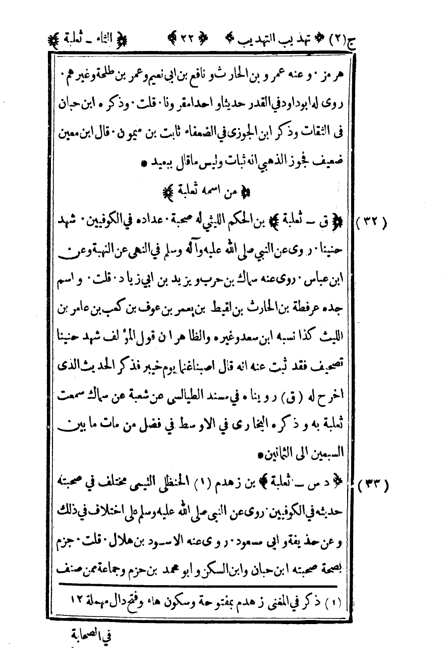 33- "د س– ثعلبة" بن زهدم1 الحنظلي التيمي مختلف في صحبته حديثه في الكوفيين روى عن النبي صلى الله عليه وسلم على اختلاف في ذلك وعن حذيفة وأبي مسعود روى عنه الأسود بن هلال. قلت: جزم بصحة صحبته بن حبان وابن السكن وأبو محمد بن حزم وجماعة ممن صنف