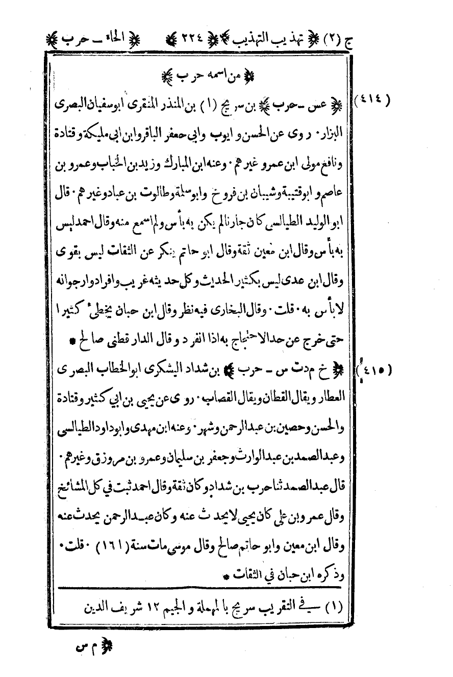 414- "عس – حرب" بن سريج1 بن المنذر المنقري أبو سفيان البصري البزار روى عن الحسن وأيوب وأبي جعفر الباقر وابن أبي مليكة وقتادة ونافع مولى بن عمرو وغيرهم. وعنه بن المبارك وزيد بن الخباب وعمرو بن عاصم وأبو قتيبة وشيبان بن فروخ وأبو سلمة وطالوت بن عباد وغيرهم. قال أبو الوليد الطيالسي كان جارنا لم يكن به بأس ولم أسمع منه وقال أحمد ليس به بأس وقال بن معين ثقة وقال أبو حاتم ينكر عن الثقات وليس بقوي وقال بن عدي ليس بكثير الحديث وكل حديثه غريب وأفراد وأرجو أنه لا بأس به قلت وقال البخاري فيه نظر وقال بن حبان يخطىء كثيرا حتى خرج عن حد الاحتجاج به إذا انفرد وقال الدارقطني صالح.