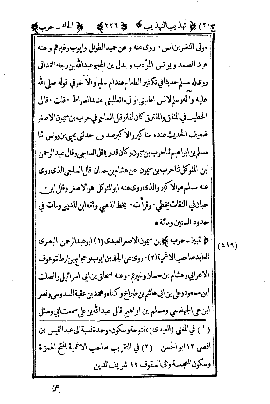 419- "تمييز- حرب" بن ميمون الأصغر العبدي1 أبو عبد الرحمن البصري العابد صاحب الأغمية2 روى عن الجلد بن أيوب وحجاج بن أرطاة وعوف الأعرابي وهشام بن حسان وغيرهم وعنه إسحاق بن أبي إسرائيل والصلت بن مسعود وعلي بن أبي هشام بن طبراخ وكناه ومحمد بن عقبة السدوسي ونصر بن علي الجهضمي ومسلم بن إبراهيم قال عبد الله بن علي سمعت أبي وسئل