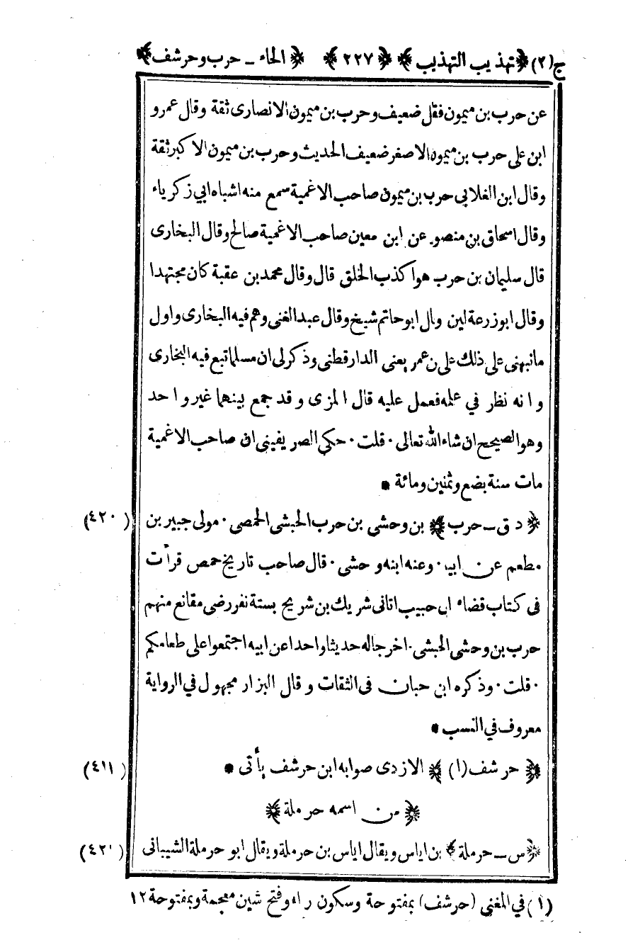 420- "د ق – حرب" بن وحشي بن حرب الحبشي الحمصي مولى جبير بن مطعم عن أبيه وعنه ابنه وحشي قال صاحب تاريخ حمص قرأت في كتاب قضاء قال حبيب أتاني شريك بن شريح بستة نفر رضي مقانع منهم حرب بن وحشي الحبشي أخرجا له حديثا واحدا عن أبيه اجتمعوا على طعامكم. قلت: وذكره بن حبان في الثقات وقال البزار مجهول في الرواية معروف في النسب.