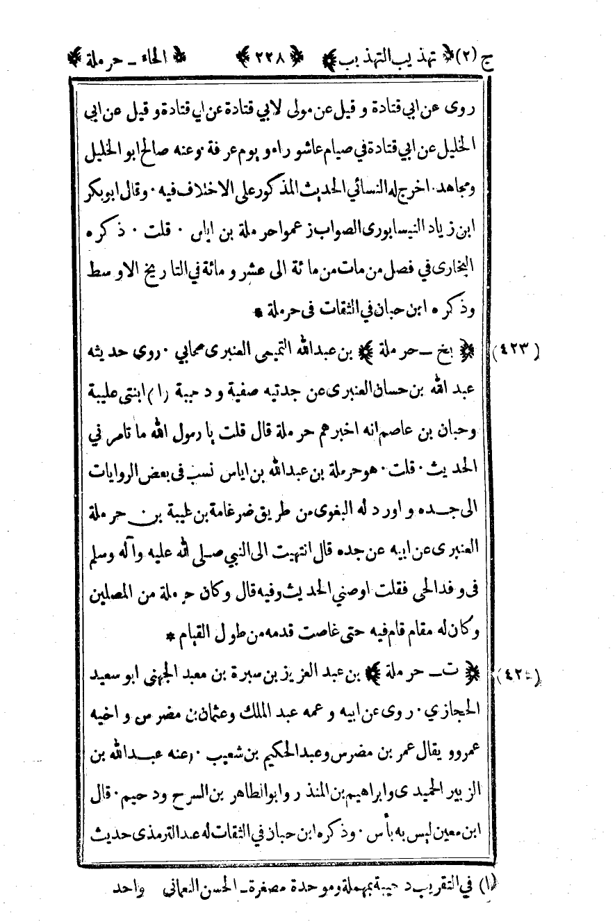 423- "بخ – حرملة" بن عبد الله التميمي العنبري صحابي روى حديثه عبد الله بن حسان العنبري عن جدتيه صفية ودحيبة1 ابنتي عليبة وحبان بن عاصم أنه أخبرهم حرملة قال قلت يا رسول الله ما تأمرني الحديث. قلت: هو حرملة بن عبد الله بن إياس نسب في بعض الروايات إلى جده وأورد له البغوي من طريق ضرغامة بن عليبة بن حرملة العنبري عن أبيه عن جده قال انتهيت إلى النبي صلى الله عليه وسلم في وفد الحي. فقلت: أوصني الحديث وفيه قال وكان حرملة من المصلين وكان له مقام قام فيه حتى غاصت قدمه من طول القيام.