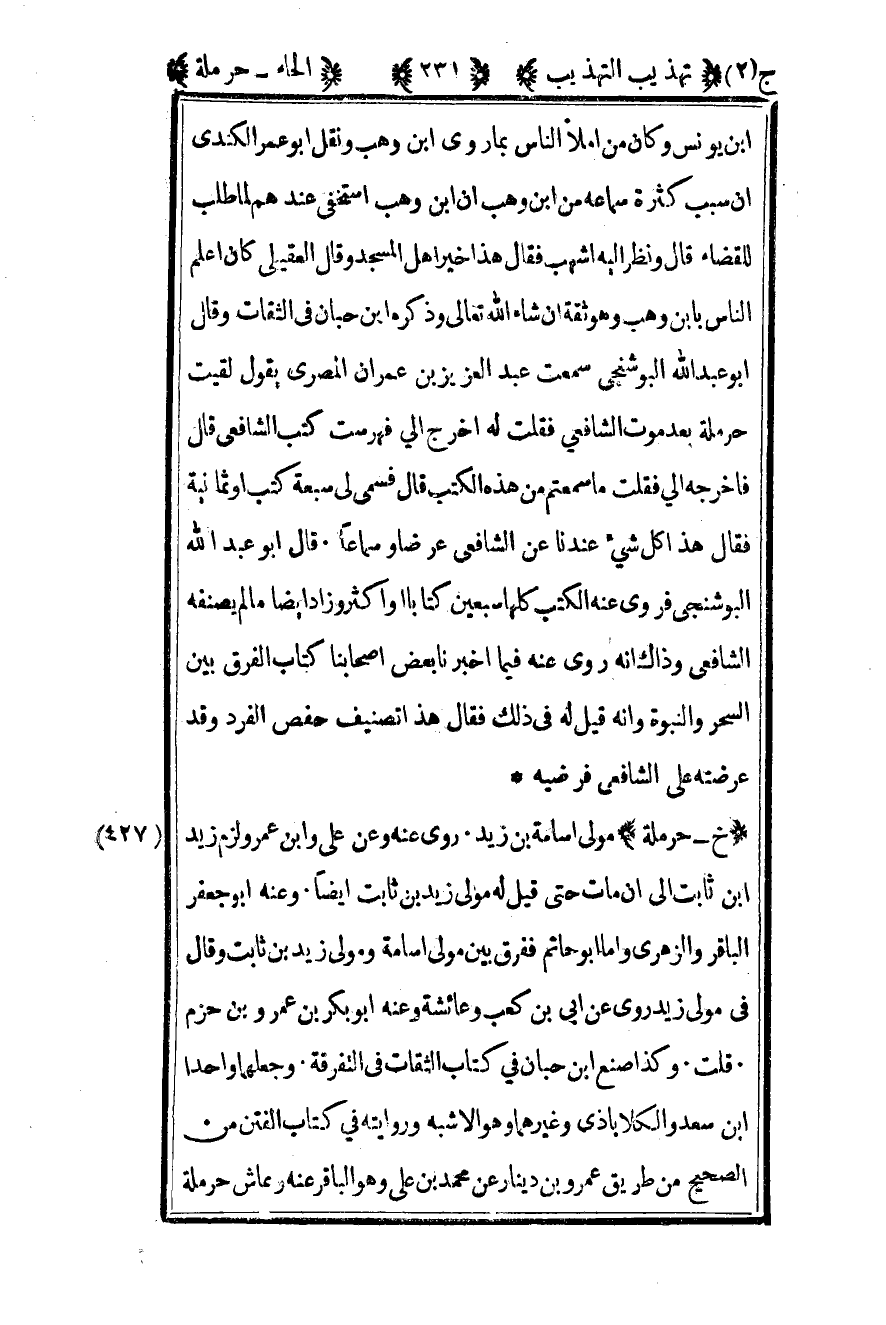 ابن يونس وكان من املأ الناس بما روى بن وهب ونقل أبو عمر الكندي أن سبب كثرة سماعه من بن وهب أن بن وهب استخفى عندهم لما طلب للقضاء قال ونظر إليه أشهب فقال هذا خير أهل المسجد وقال العقيلي كان أعلم الناس بابن وهب وهو ثقة إن شاء الله تعالى وذكره بن حبان في الثقات وقال أبو عبد الله البوشنجي سمعت عبد العزيز بن عمران المصري يقول لقيت حرملة بعد موت الشافعي فقلت له أخرج إلي فهرست كتب الشافعي قال فأخرجه إلي فقلت ما سمعتم من هذه الكتب قال فسمى لي سبعة كتب أو ثمانية فقال هذا كل شيء عندنا عن الشافعي عرضا وسماعا قال أبو عبد الله البوشنجي فروى عنه الكتب كلها سبعين كتابا أو أكثر وزاد أيضا ما لم يصنفه الشافعي وذاك أنه روى عنه فيما أخبرنا بعض أصحابنا كتاب الفرق بين السحر والنبوة وأنه قيل له في ذلك فقال هذا تصنيف حفص الفرد وقد عرضته على الشافعي فرضيه.
