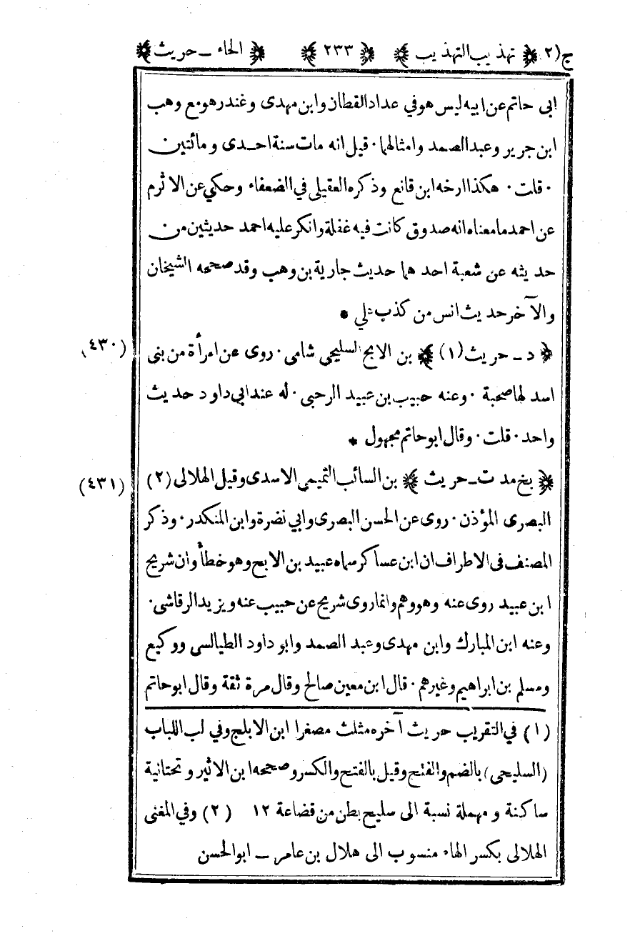 430- "د – حريث" بن الأبح السليحي شامي روى عن امرأة من بني أسد لها صحبة وعنه حبيب بن عبيد الرحبي له عند أبي داود حديث واحد قلت وقال أبو حاتم مجهول.