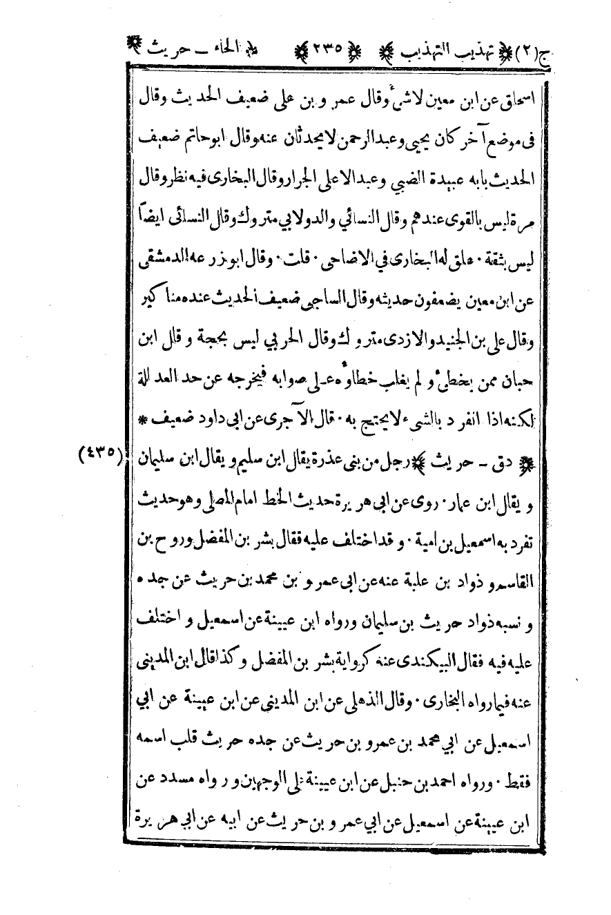 435- "د ق – حريث" رجل من بني عذرة يقال بن سليم ويقال بن سليمان ويقال بن عمار روى عن أبي هريرة حديث الخط أمام المصلي تفرد به إسماعيل بن أمية وقد اختلف عليه فقال بشر بن المفضل وروح بن القاسم وذواد بن علبة عنه عن أبي عمرو بن محمد بن حريث عن جده ونسبه ذواد حريث بن سليمان ورواه بن عيينة عن إسماعيل واختلف عليه فيه فقال البيكندي عنه كرواية بشر بن المفضل وكذا قال بن المديني عنه فيما رواه البخاري وقال الذهلي عن بن المديني عن بن عيينة عن أبي إسماعيل عن أبي محمد بن عمرو بن حريث عن جده حريث قلب اسمه فقط ورواه أحمد بن حنبل عن بن عيينة على الوجهين ورواه مسدد عن بن عيينة عن إسماعيل عن أبي عمرو بن حريث عن أبيه عن أبي هريرة