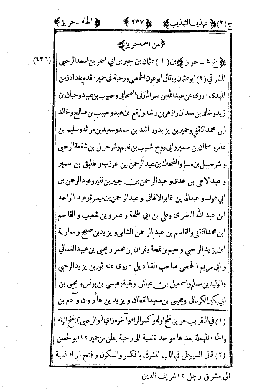 436- "خ 4 – حريز" بن1 عثمان بن جبر بن أبي أحمر بن أسعد الرحبي المشرقي2 أبو عثمان ويقال أبو عون الحمصي ورحبة في حمير قدم بغداد زمن المهدي روى عن عبد الله بن بسر المازني الصحابي وحبيب بن عبيد وحبان بن زيد وخالد بن معدان وأزهر بن راشد وأيفع بن عبد وحبيب بن صالح وخالد بن محمد الثقفي وحمير بن يزيد وراشد بن سعد وسعيد بن مرثد وسليم بن عامر وسلمان بن سمير وأبي روح شبيب بن نعيم وشرحبيل بن شفعة الرحبي وشرحبيل بن مسلم والضحاك بن عبد الرحمن بن عزرب وطليق بن سمير وعبد الأعلى بن عدي وعبد الرحمن بن جبير بن نفير وعبد الرحمن بن أبي عوف وعبد الله بن غابر الألهاني وعبد الرحمن بن ميسرة وعبد الواحد بن عبد الله البصري وعلي بن أبي طلحة وعمرو بن شعيب والقاسم بن محمد الثقفي والقاسم بن عبد الرحمن الشاسي ويزيد بن صبيح ومعاوية بن يزيد الرحبي ونعيم بن نمحة ونمران بن مخمر ويحيى بن عبيد الغساني وأبي مريم الحمصي صاحب القناديل روى عنه ثور بن يزيد الرحبي والوليد بن مسلم وإسماعيل بن عياش وبقية وعيسى بن يونس ويحيى بن أبي بكير الكرماني ويحيى بن سعيد القطان ويزيد بن هارون وآدم بن
