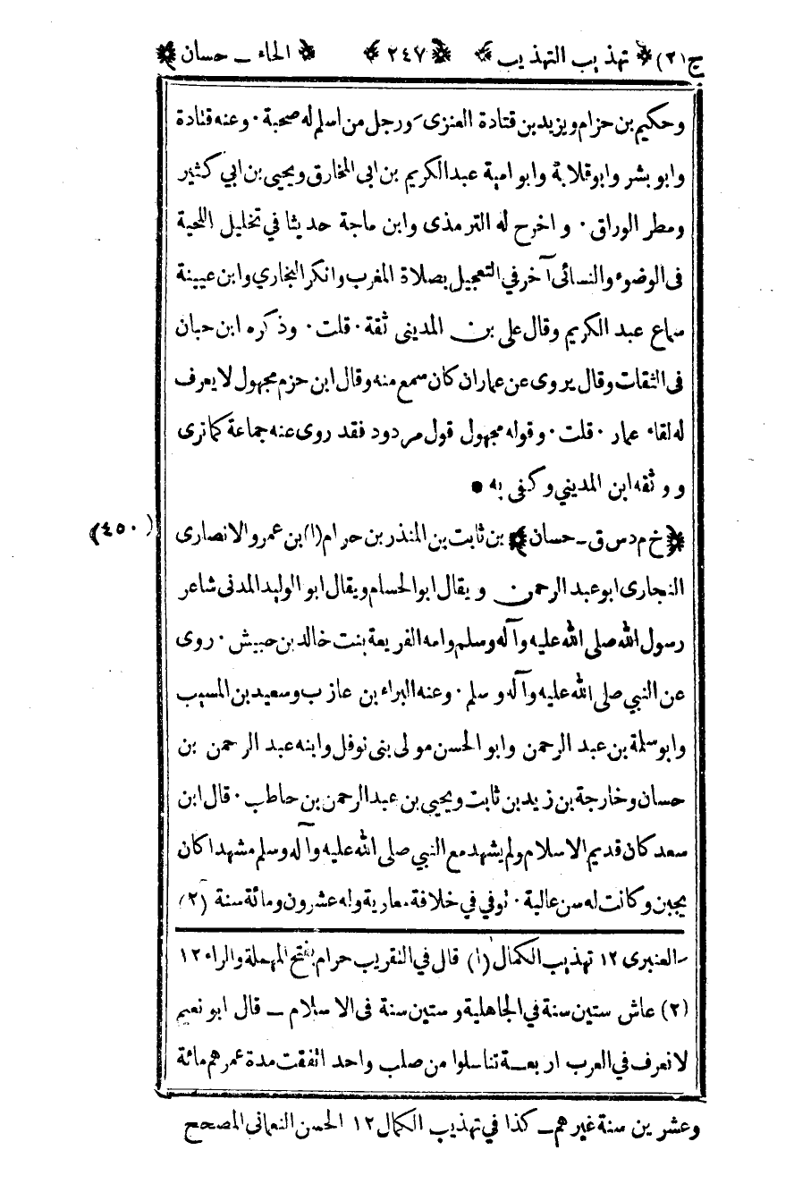 450- "خ م د س ق – حسان" بن ثابت بن المنذر بن حرام1 بن عمرو الأنصاري النجاري أبو عبد الرحمن ويقال أبو الحسام ويقال أبو الوليد المدني شاعر رسول الله صلى الله عليه وسلم وأمه الفريعة بنت خالد بن حبيش روى عن النبي صلى الله عليه وسلم وعنه البراء بن عازب وسعيد بن المسيب وأبو سلمة بن عبد الرحمن وأبو الحسن مولى بني نوفل وابنه عبد الرحمن بن حسان وخارجة بن زيد بن ثابت ويحيى بن عبد الرحمن بن حاطب قال بن سعد كان قديم الإسلام ولم يشهد مع النبي صلى الله عليه وسلم مشهدا كان يجبن وكانت له سن عالية توفي في خلافة معاوية وله عشرون ومائة سنة2