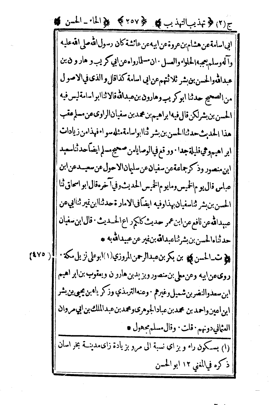 475- "ت – الحسن" بن بكر بن عبد الرحمن المروزي1 أبو علي نزيل مكة روى عن أبيه وعن معلى بن منصور ويزيد بن هارون ويعقوب بن إبراهيم بن سعد والنضر بن شميل وغيرهم وعنه الترمذي وزكرياء بن يحيى بن بشر بن أعين وأحمد بن محمد بن عباد الجوهري ومحمد بن عبد الملك بن أبي مروان العثماني دونهم. قلت: وقال مسلم مجهول.