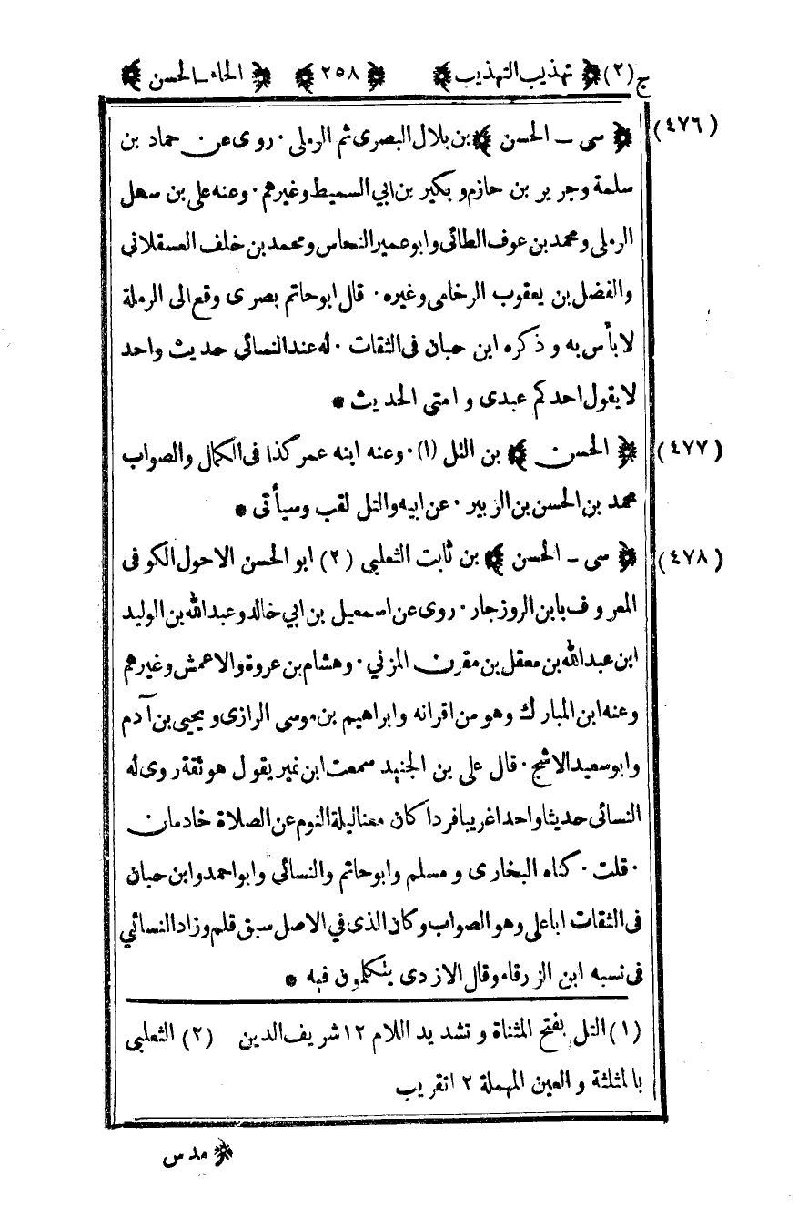 477- "الحسن" بن التل1 وعنه ابنه عمر كذا في الكمال والصواب محمد بن الحسن بن الزبير عن أبيه والتل لقب وسيأتي.