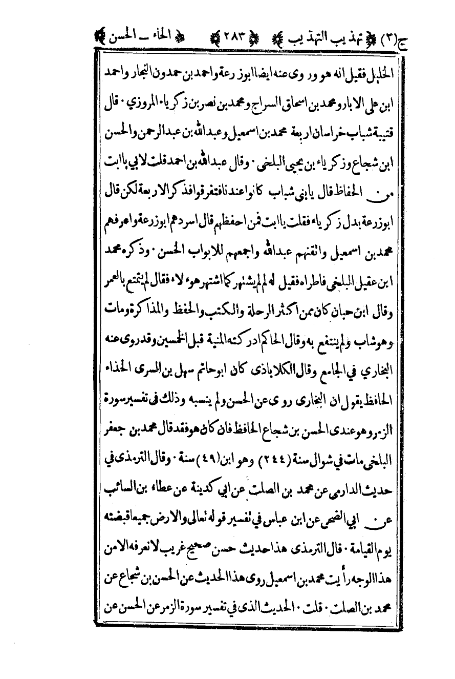 الخليل فقيل إنه هو وروى عنه أيضا أبو زرعة وأحمد بن حمدون النجار وأحمد بن علي الآبار ومحمد بن إسحاق السراج ومحمد بن نصر بن زكريا المروزي قال قتيبة شباب خراسان أربعة محمد بن إسماعيل وعبد الله بن عبد الرحمن والحسن بن شجاع وزكرياء بن يحيى البلخي وقال عبد الله بن أحمد قلت لأبي يا أبت من الحفاظ قال يا بني شباب كانوا عندنا فتفرقوا فذكر الأربعة لكن قال أبو زرعة بدل زكريا فقلت يا أبت فمن أحفظهم قال أسردهم أبو زرعة وأعرفهم محمد بن إسماعيل واتقنهم عبد الله وأجمعهم لأبواب الحسن وذكره محمد بن عقيل البلخي فأطراه فقيل له لم لم يشتهر كما اشتهر هؤلاء فقال لم يتمتع بالعمر وقال بن حبان كان ممن أكثر الرحلة والكتب والحفظ والمذاكرة ومات وهو شاب ولم ينتفع به وقال الحاكم أدركته المنية قبل الخمسين وقد روى عنه البخاري في الجامع وقال الكلاباذي كان أبو حاتم سهل بن السري الحذاء الحافظ يقول إن البخاري روى عن الحسن ولم ينسبه وذلك في تفسير سورة الزمر وهو عندي الحسن بن شجاع الحافظ فإن كان هو فقد قال محمد بن جعفر البلخي مات في شوال سنة "244" وهو ابن "49" سنة. وقال الترمذي في حديث الدارمي عن محمد بن الصلت عن أبي كدينة عن عطاء بن السائب عن أبي الضحى عن بن عباس في تفسير قوله تعالى والأرض جميعا قبضته يوم القيامة قال الترمذي هذا حديث حسن صحيح غريب لا نعرفه إلا من هذا الوجه رأيت محمد بن إسماعيل روى هذا الحديث عن الحسن بن شجاع عن محمد بن الصلت. قلت: الحديث الذي في تفسير سورة الزمر عن الحسن عن