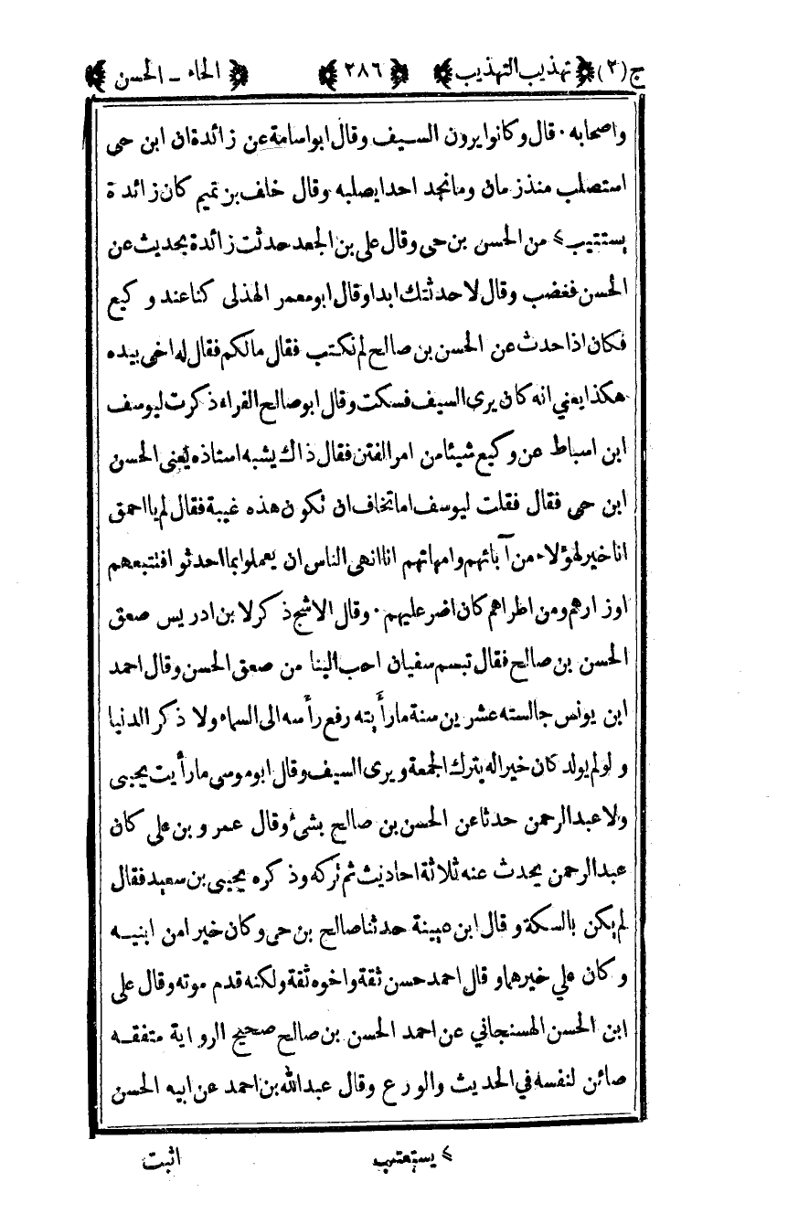 وأصحابه قال وكانوا يرون السيف وقال أبو أسامة عن زائدة أن بن حي استصلب منذ زمان وما نجد أحدا يصلبه وقال خلف بن تميم كان زائدة يستتيب من الحسن بن حي وقال علي بن الجعد حدثت رائدة بحديث عن الحسن فغضب وقال لا حدثتك أبدا وقال أبو معمر الهذلي كنا عند وكيع فكان إذا حدث عن الحسن بن صالح لم نكتب فقال ما لكم فقال له أخي بيده هكذا يعني أنه كان يرى السيف فسكت وقال أبو صالح الفراء ذكرت ليوسف بن أسباط عن وكيع شيئا من أمر الفتن فقال ذاك يشبه أستاذه يعني الحسن بن حي فقال فقلت ليوسف ما تخاف أن تكون هذه غيبة فقال لم يا أحمق أنا خير لهؤلاء من آبائهم وأمهاتهم أنا أنهى الناس أن يعملوا بما أحدثوا فتتبعهم أوزارهم ومن اطراهم كان أضر عليهم وقال الأشج ذكر لابن إدريس صعق الحسن بن صالح فقال تبسم سفيان أحب إلينا من صعق الحسن وقال أحمد بن يونس جالسته عشرين سنة ما رأيته رفع رأسه إلى السماء ولا ذكر الدنيا ولو لم يولد كان خيرا له يترك الجمعة ويرى السيف وقال أبو موسى ما رأيت يحيى ولا عبد الرحمن حدثا عن الحسن بن صالح بشيء وقال عمرو بن علي كان عبد الرحمن يحدث عنه ثلاثة أحاديث ثم تركه وذكره يحيى بن سعيد فقال لم يكن بالسكة وقال بن عيينة حدثنا صالح بن حي وكان خيرا من ابنيه وكان علي خيرهما وقال أحمد حسن ثقة وأخوه ثقة ولكنه قدم موته وقال علي بن الحسن الهسنجاني عن أحمد الحسن بن صالح صحيح الرواية متفقه صائن لنفسه الحديث والورع وقال عبد الله بن أحمد عن أبيه الحسن