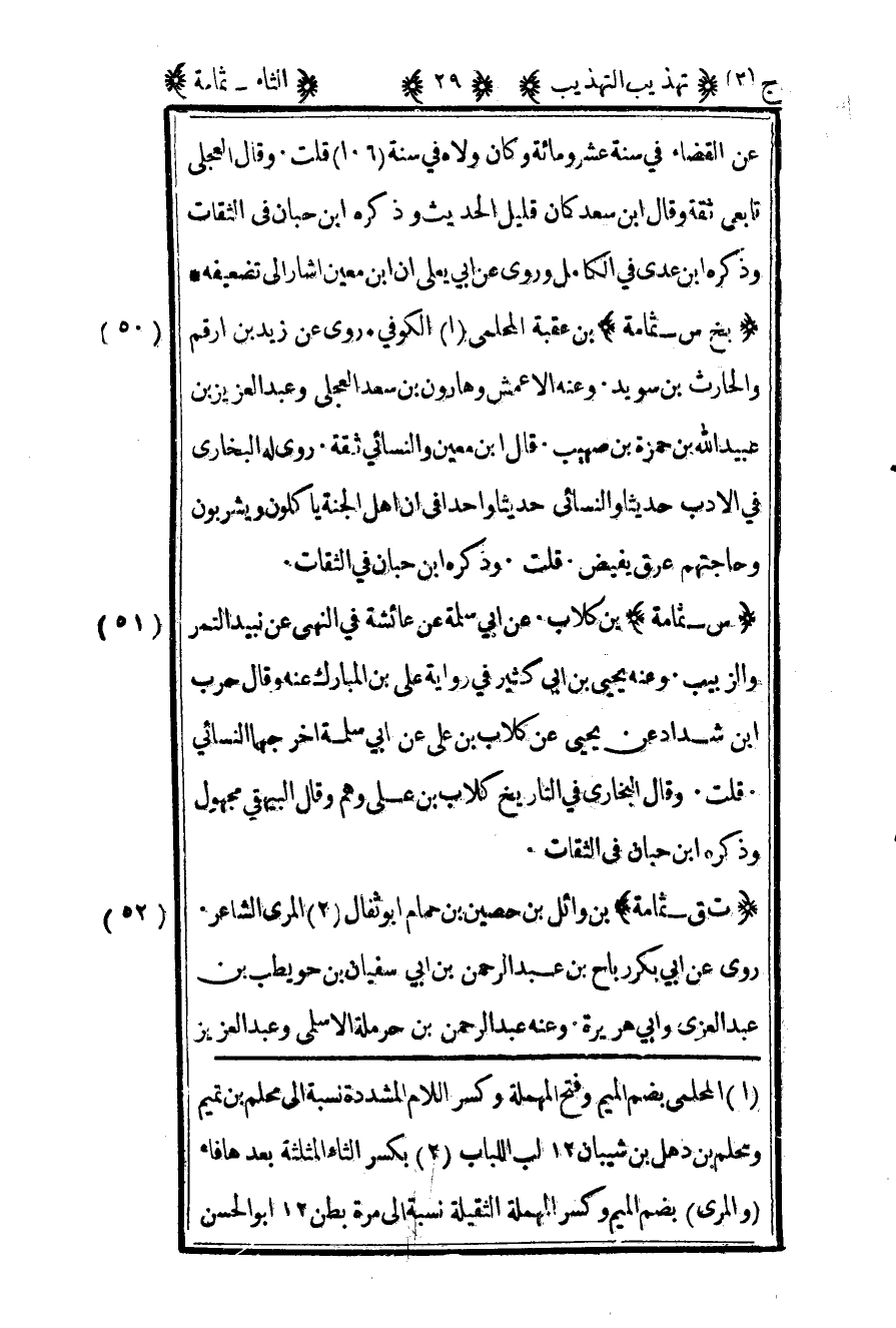 50- "بخ س – ثمامة" بن عقبة الملحمي1 الكوفي روى عن زيد بن أرقم والحارث بن سويد وعنه الأعمش وهارون بن سعد العجلي وعبد العزيز بن عبيد الله بن حمزة بن صهيب قال بن معين والنسائي ثقة روى له البخاري في الأدب حديثا والنسائي حديثا واحدا في أن أهل الجنة يأكلون ويشربون وحاجتهم عرق يفيض قلت وذكره بن حبان في الثقات.