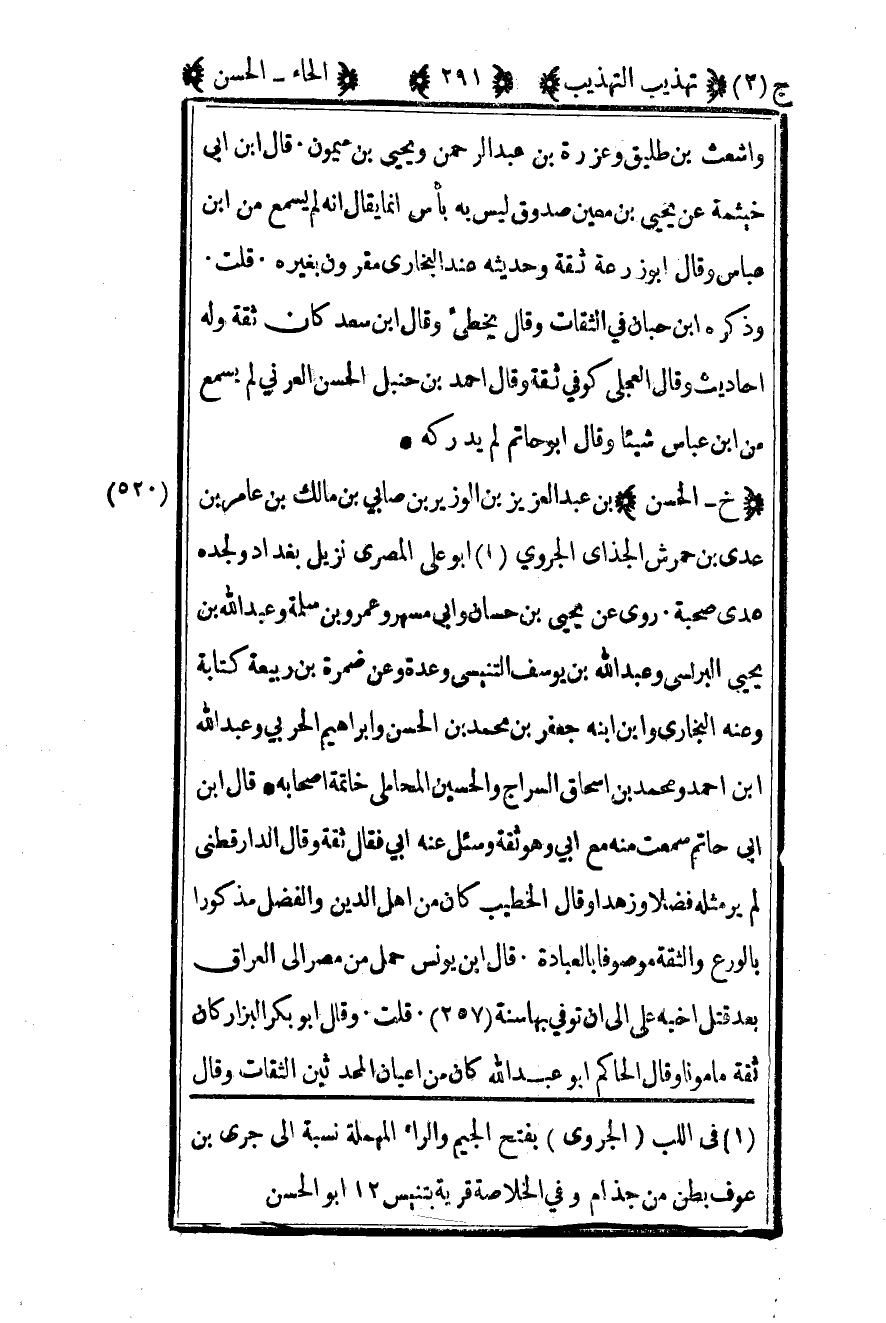 520- "خ – الحسن" بن عبد العزيز بن الوزير بن صابىء بن مالك بن عامر بن عدي بن حمرش الجذاي الجروي1 أبو علي المصري نزيل بغداد ولجده عدي صحبة روى عن يحيى بن حسان وأبي مسهر وعمرو بن سلمة وعبد الله بن يحيى البرلسي وعبد الله بن يوسف التنيسي وعدة وعن ضمرة بن ربيعة كتابة وعنه البخاري وابن ابنه جعفر بن محمد بن الحسن وإبراهيم الحربي وعبد الله بن أحمد ومحمد بن إسحاق السراج والحسين المحاملي خاتمة أصحابه قال بن أبي حاتم سمعت منه مع أبي وهو ثقة وسئل عنه أبي فقال ثقة وقال الدارقطني لم ير مثله فضلا وزهدا وقال الخطيب كان من أهل الدين والفضل مذكورا بالورع والثقة موصوفا بالعبادة قال بن يونس حمل من مصر إلى العراق بعد قتل أخيه علي إلى أن توفي بها سنة 257 قلت وقال أبو بكر البزار كان ثقة مأمونا وقال الحاكم أبو عبد الله كان من أعيان المحدثين الثقات وقال