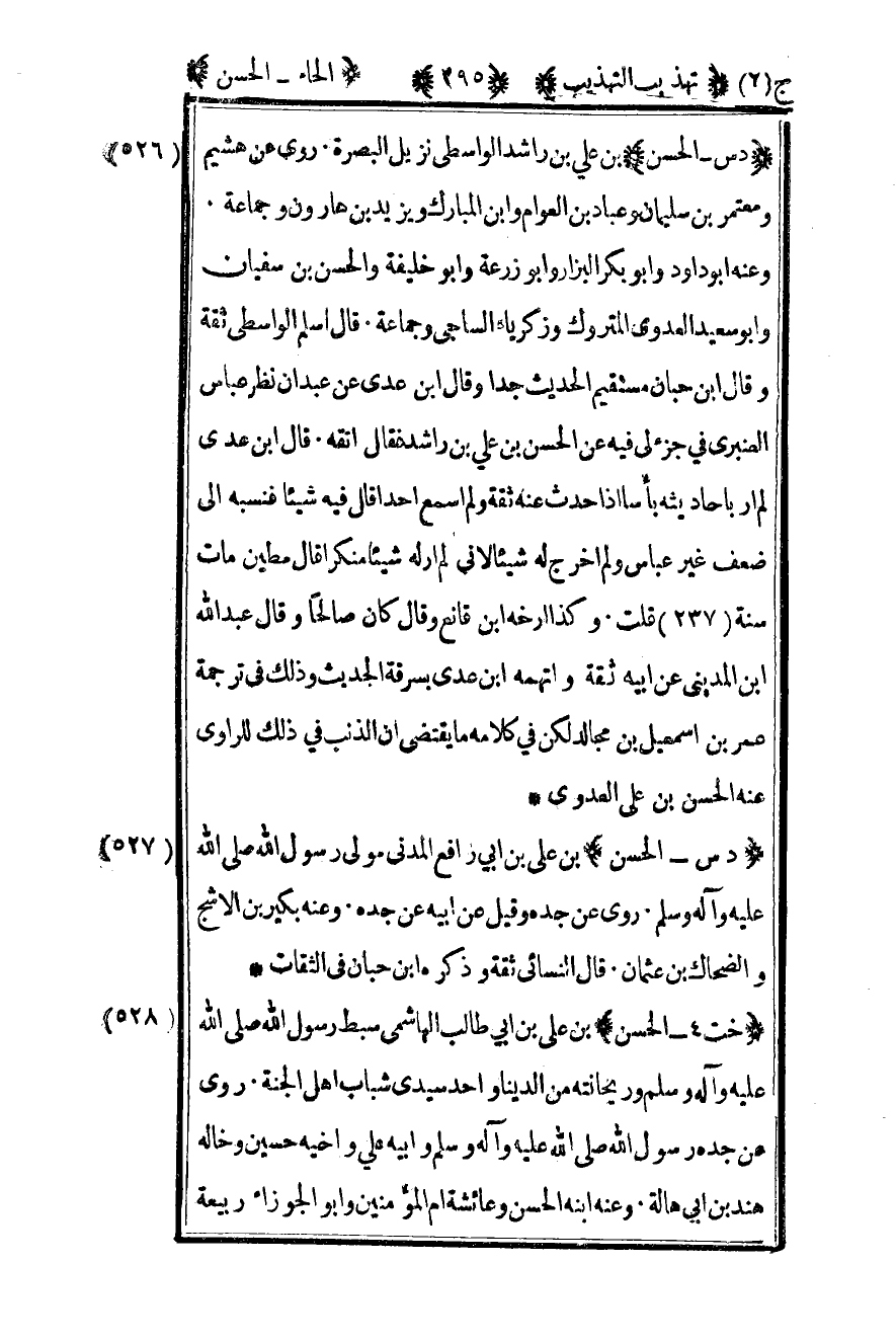 528- "خت 4 – الحسن" بن علي بن أبي طالب الهاشمي سبط رسول الله صلى الله عليه وسلم وريحانته من الدنيا واحد سيدي شباب أهل الجنة. روى عن جده رسول الله صلى الله عليه وسلم وأبيه علي وأخيه حسين وخاله هند بن أبي هالة وعنه ابنه الحسن وعائشة أم المؤمنين وأبو الجوزاء ربيعة