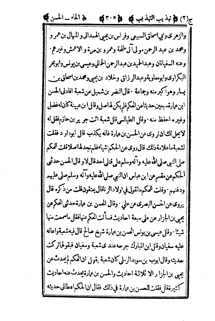 والزهري وأبي إسحاق السبيعي وفراس بن يحيى الهمداني والمنهال بن عمرو ومحمد بن عبد الرحمن مولى آل طلحة وعمرو بن مرة والأعمش وغيرهم. وعنه السفيانان وعبد الحميد بن عبد الرحمن الحماني وعيسى بن يونس وأبو بحر البكراوي وأبو معاوية وعبد الرزاق وخلاد بن يحيى ومحمد بن إسحاق بن يسار وهو أكبر منه وجماعة قال النضر بن شميل عن شعبة أفادني الحسن بن عمارة سبعين حديثا عن الحكم فلم يكن لها أصل وقال بن عيينة كان له فضل وغيره أحفظ منه وقال الطيالسي قال شعبة ائت جرير بن حازم فقل له لا يحل لك أن تروي عن الحسن بن عمارة فإنه يكذب قال أبو داود. فقلت: لشعبة ما علامة ذلك قال روى عن الحكم أشياء فلم نجد لها أصلا. قلت: للحكم صلى النبي صلى الله عليه وسلم على قتلى أحد قال لا وقال الحسن حدثني الحكم عن مقسم عن بن عباس أن النبي صلى الله عليه وسلم صلى عليهم ودفنهم وقلت للحكم ما تقول في أولاد الزنا قال يعتقون. قلت: من ذكره قال يروي عن الحسن البصري عن علي وقال الحسن بن عمارة حدثني الحكم عن يحيى بن الجزار عن علي سبعة أحاديث فسألت الحكم عنها فقال ما سمعت منها شيئا وقال عيسى بن يونس الحسن بن عمارة شيخ صالح قال فيه شعبة وأعانه عليه سفيان وقال بن المبارك جرحه عندي شعبة وسفيان فبقولهما تركت حديثه وقال أيوب بن سويد الرملي كان شعبة يقول إن الحكم لم يحدث عن يحيى بن الجزار إلا ثلاثة أحاديث والحسن بن عمارة يحدث عنه أحاديث كثيرة قال فقلت للحسن بن عمارة في ذلك فقال إن الحكم أعطاني حديثه