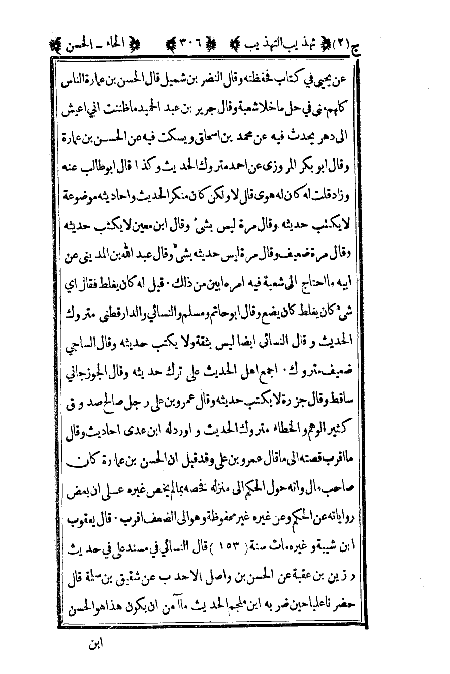 عن يحيى في كتاب فحفظته وقال النضر بن شميل قال الحسن بن عمارة الناس كلهم مني في حل ما خلا شعبة وقال جرير بن عبد الحميد ما ظننت أني أعيش إلى دهر يحدث فيه عن محمد بن إسحاق ويسكت فيه عن الحسن بن عمارة وقال أبو بكر المروزي عن أحمد متروك الحديث وكذا قال أبو طالب عنه وزاد قلت له كان له هوى قال ولكن كان منكر الحديث وأحاديثه موضوعة لا يكتب حديثه وقال مرة ليس بشيء وقال بن معين لا يكتب حديثه وقال مرة ضعيف وقال مرة ليس حديثه بشيء وقال عبد الله بن المديني عن أبيه ما أحتاج إلى شعبة فيه أمره أبين من ذلك قيل له كان يغلط فقال أي شيء كان يغلط كان يضع وقال أبو حاتم ومسلم والنسائي والدارقطني متروك الحديث وقال النسائي أيضا ليس بثقة ولا يكتب حديثه وقال الساجي ضعيف متروك أجمع أهل الحديث على ترك حديثه وقال الجوزجاني ساقط وقال جزرة لا يكتب حديثه وقال عمرو بن علي رجل صالح صدوق كثير الوهم والخطأ متروك الحديث وأورد له بن عدي أحاديث وقال ما أقرب قصته إلى ما قال عمرو بن علي وقد قيل إن الحسن بن عمارة كان صاحب مال وإنه حول الحكم إلى منزله فخصه بما لم يخص غيره على أن بعض رواياته عن الحكم وعن غيره غير محفوظة وهو إلى الضعف أقرب قال يعقوب بن شيبة وغيره مات سنة "153" قال النسائي في مسند علي في حديث رزين بن عقبة عن الحسن بن واصل الأحدب عن شقيق بن سلمة قال حضرنا عليا حين ضربه بن ملجم الحديث ما آمن أن يكون هذا هو الحسن