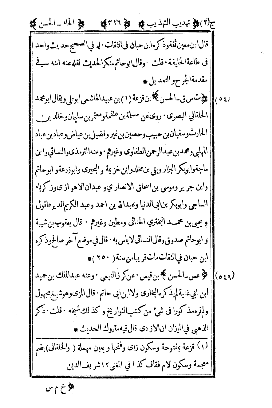 549- "عس – الحسن" بن قيس عن كرز التيمي وعنه عبد الملك بن حميد بن أبي غنية لم يذكره البخاري ولا ابن أبي حاتم قال المزي وهو شيخ مجهول ولم نره مذكورا في شيء من كتب التواريخ وكذلك شيخه. قلت: ذكر الذهبي في الميزان أن الأزدي قال فيه متروك الحديث.