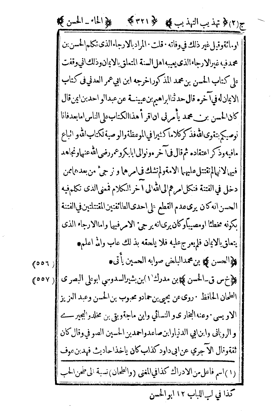 557- "خ س ق – الحسن" بن مدرك1 بن بشير السدوسي أبو علي البصري الطحان الحافظ روى عن يحيى بن حماد ومحبوب بن الحسن وعبد العزيز الأويسي وعنه البخاري والنسائي وابن ماجة وبقي بن مخلد والبجيري والروياني وابن أبي الدنيا وابن صاعد وأحمد بن الحسين الصوفي وقال كان ثقة وقال الآجري عن أبي داود كذاب كان يأخذ أحاديث فهد بن عوف