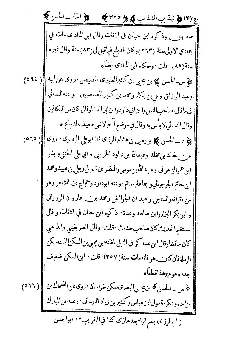 565- "د – الحسن" بن يحيى بن هشام الرزي1 أبو علي البصري روى عن خالد بن مخلد وعبد الله بن داود الخريبي وأبي علي الحنفي وبشر بن عمر الزهراني وعبيد الله بن موسى والنضر بن شميل ويعلى بن عبيد ومحمد بن حاتم الجرجرائي وجماعة بعدهم وعنه أبو داود وحجاج بن الشاعر وهو من أقرانه والساجي وعبدان الجواليقي ومحمد بن هارون الروياني وأبو بكر البزار وابن صاعد وعدة ذكره ابن حبان في الثقات وقال مستقيم الحديث كان صاحب حديث. قلت: وقال الصريفيني والذهبي كان حافظا وقال ابن عساكر في النبل أظنه بن يحيى بن السكن الذي سكن الرملة فإن كان هو فإنه مات سنة "257". قلت: ابن السكن ضعيف جدا وهو غير هذا قطعا.