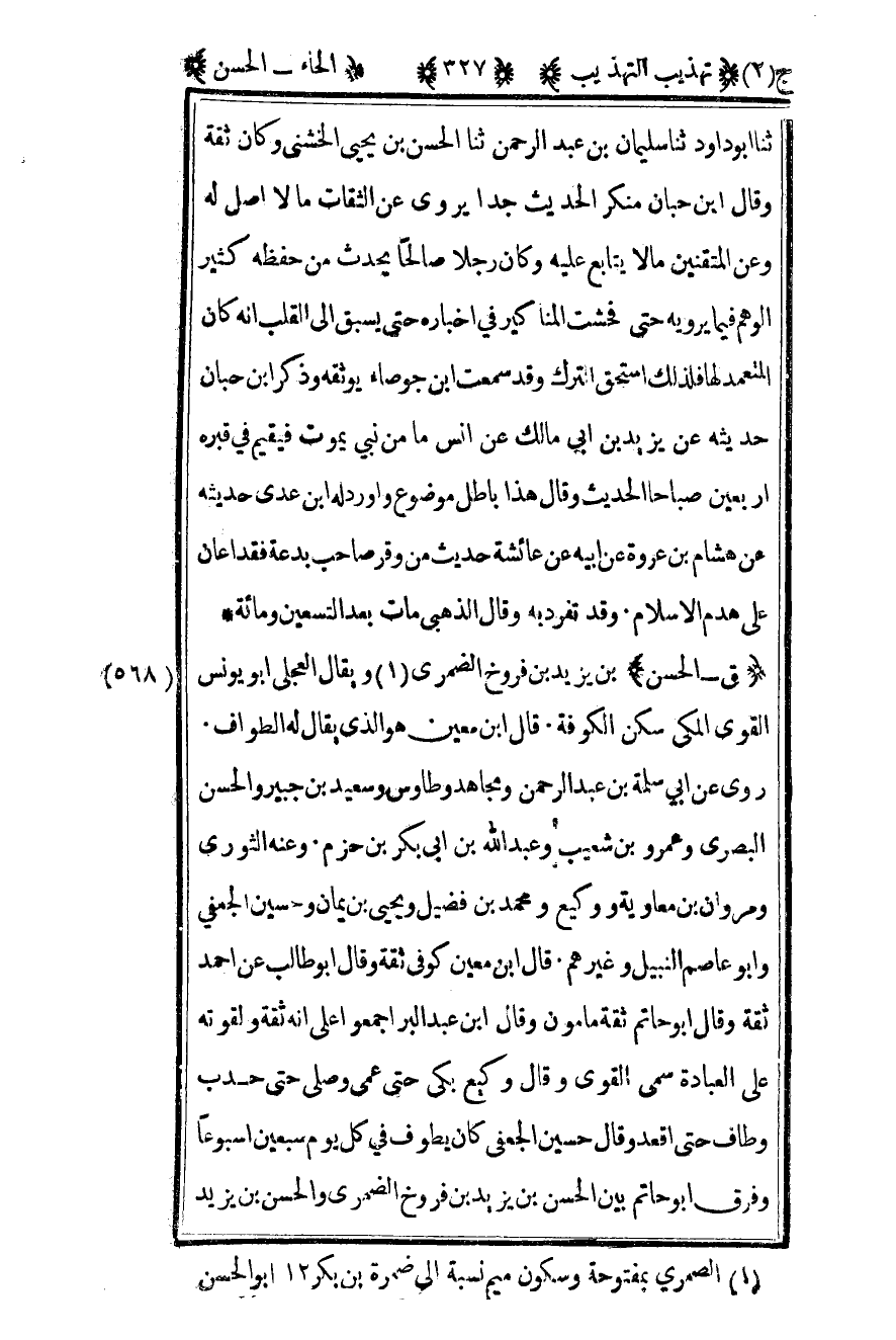 ثنا أبو داود ثنا سليمان بن عبد الرحمن ثنا الحسن بن يحيى الخشني وكان ثقة وقال بن حبان منكر الحديث جدا يروي عن الثقات ما لا أصل له وعن المتقنين ما لا يتابع عليه وكان رجلا صالحا يحدث من حفظه كثير الوهم فيما يرويه حتى فحشت المناكير في أخباره حتى يسبق إلى القلب أنه كان المتعمد لها فلذلك استحق الترك وقد سمعت بن جوصاء يوثقه وذكر ابن حبان حديثه عن يزيد بن أبي مالك عن أنس ما من نبي يموت فيقيم في قبره أربعين صباحا الحديث وقال هذا باطل موضوع وأورد له بن عدي حديثه عن هشام بن عروة عن أبيه عن عائشة حديث من وقر صاحب بدعة فقد أعان على هدم الإسلام وقد تفرد به وقال الذهبي مات بعد التسعين ومائة.
