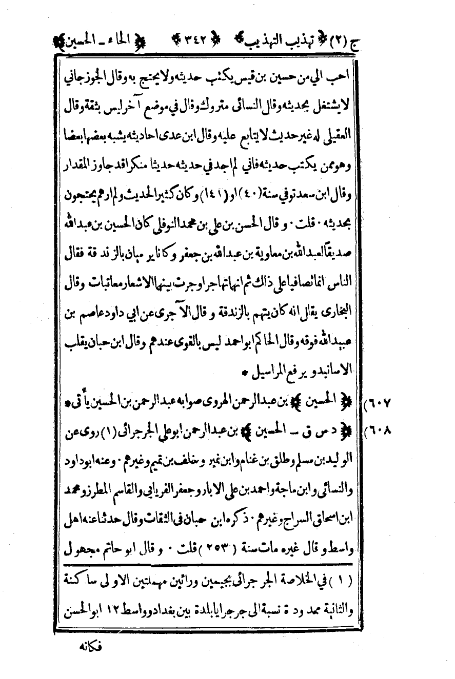 608- "د س ق – الحسين" بن عبد الرحمن أبو علي الجرجاني1 روى عن الوليد بن مسلم وطلق بن غنام وابن نمير وخلف بن تميم وغيرهم. وعنه أبو داود والنسائي وابن ماجة وأحمد بن علي الأبار وجعفر الفريابي وقاسم المطرز ومحمد بن إسحاق السراج وغيرهم ذكره ابن حبان في الثقات. وقال حدثنا عنه أهل واسط وقال غيره مات سنة "253". قلت: وقال أبو حاتم مجهول