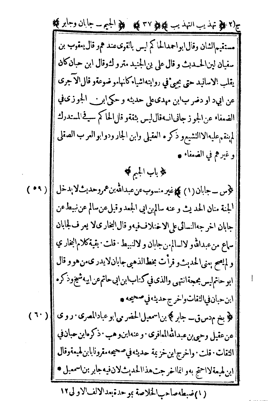 59- "س – جابان1" غير منسوب عن عبد الله بن عمرو لا يدخل الجنة منان الحديث وعنه سالم بن أبي الجعد وقيل عن سالم عن نبيط عن جابان أخرجه النسائي على الاختلاف فيه وقال البخاري لا يعرف لجابان سماع من عبد الله ولا لسالم من جابان ولا نبيط قلت بقية كلام البخاري ولم يصح يعني الحديث وقرأت بخط الذهبي جابان لا يدري من هو وقال أبو حاتم ليس بحجة انتهى والذي في كتاب بن أبي حاتم عن أبيه شيخ ذكره بن حبان في الثقات وأخرج حديثه في صحيحه.