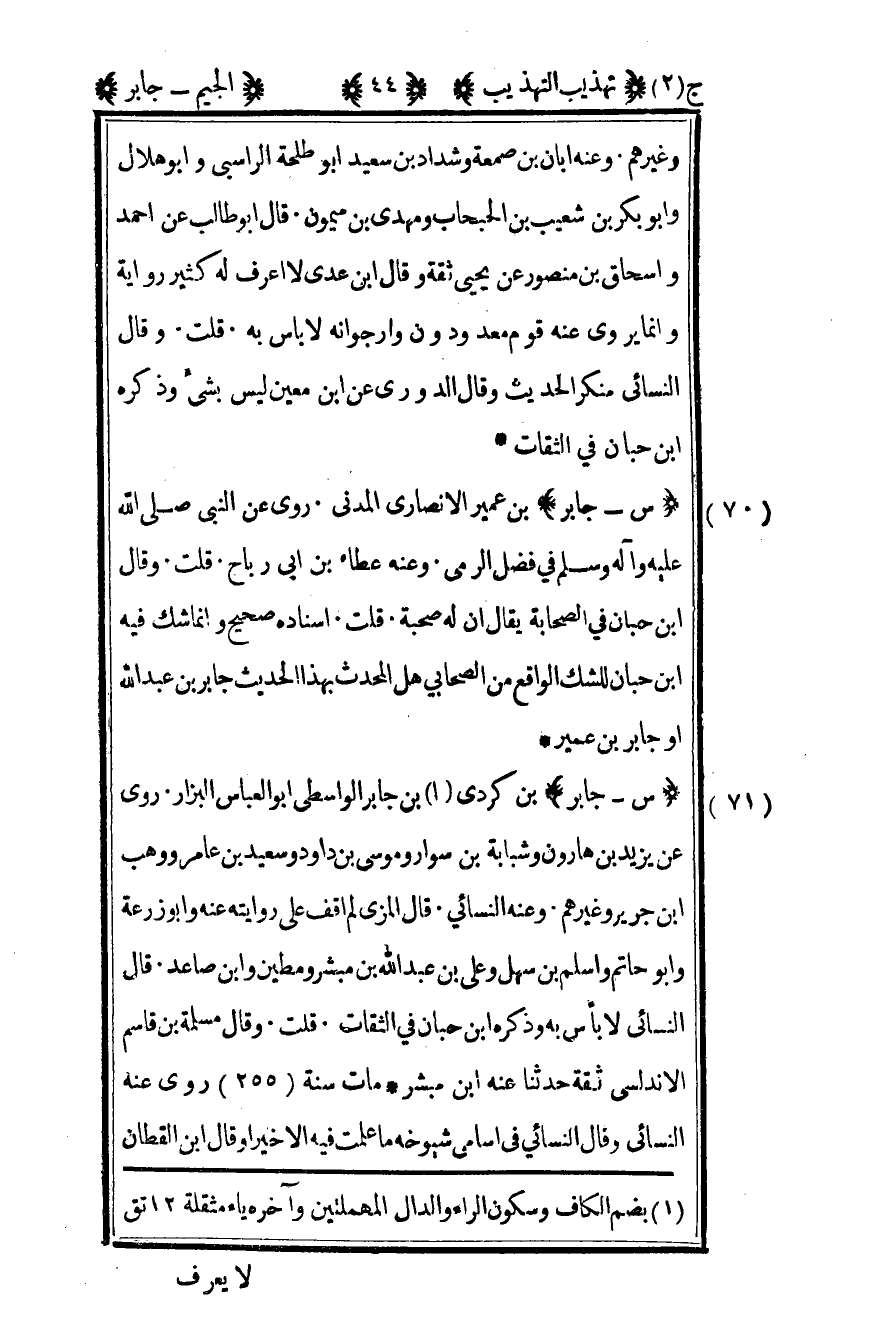 71- "س – جابر" بن كردي1 بن جابر الواسطي أبو العباس البزار روى عن يزيد بن هارون وشبابة بن سوار وموسى بن داود وسعيد بن عامر ووهب بن جرير وغيرهم وعنه النسائي قال المزي لم أقف على روايته عنه وأبو زرعة وأبو حاتم وأسلم بن سهل وعلي بن عبد الله بن مبشر ومطين وابن صاعد قال النسائي لا بأس به وذكره بن حبان في الثقات قلت وقال مسلمة بن قاسم الأندلسي ثقة حدثنا عنه بن مبشر مات سنة "255" روى عنه النسائي وقال النسائي في أسامي شيوخه ما علمت فيه الا خيرا وقال ابن القطان