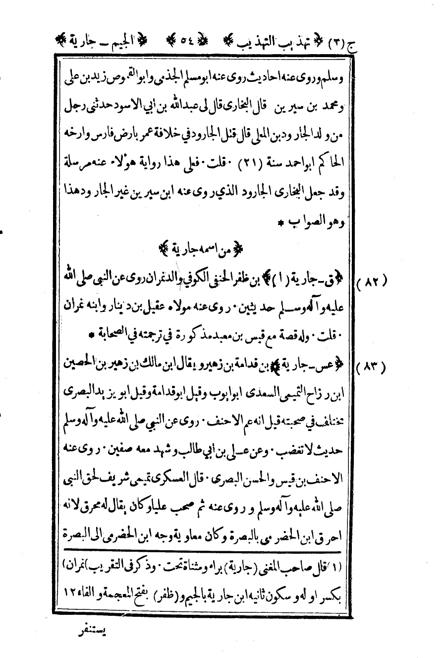 1 قال صاحب المغني "جارية" براء ومثناة تحت وذكر في التقريب "نمران" بكسر أوله وسكون ثانيه ابن جارية بالجيم و"ظفر" بفتح المعجمة والفاء "12".