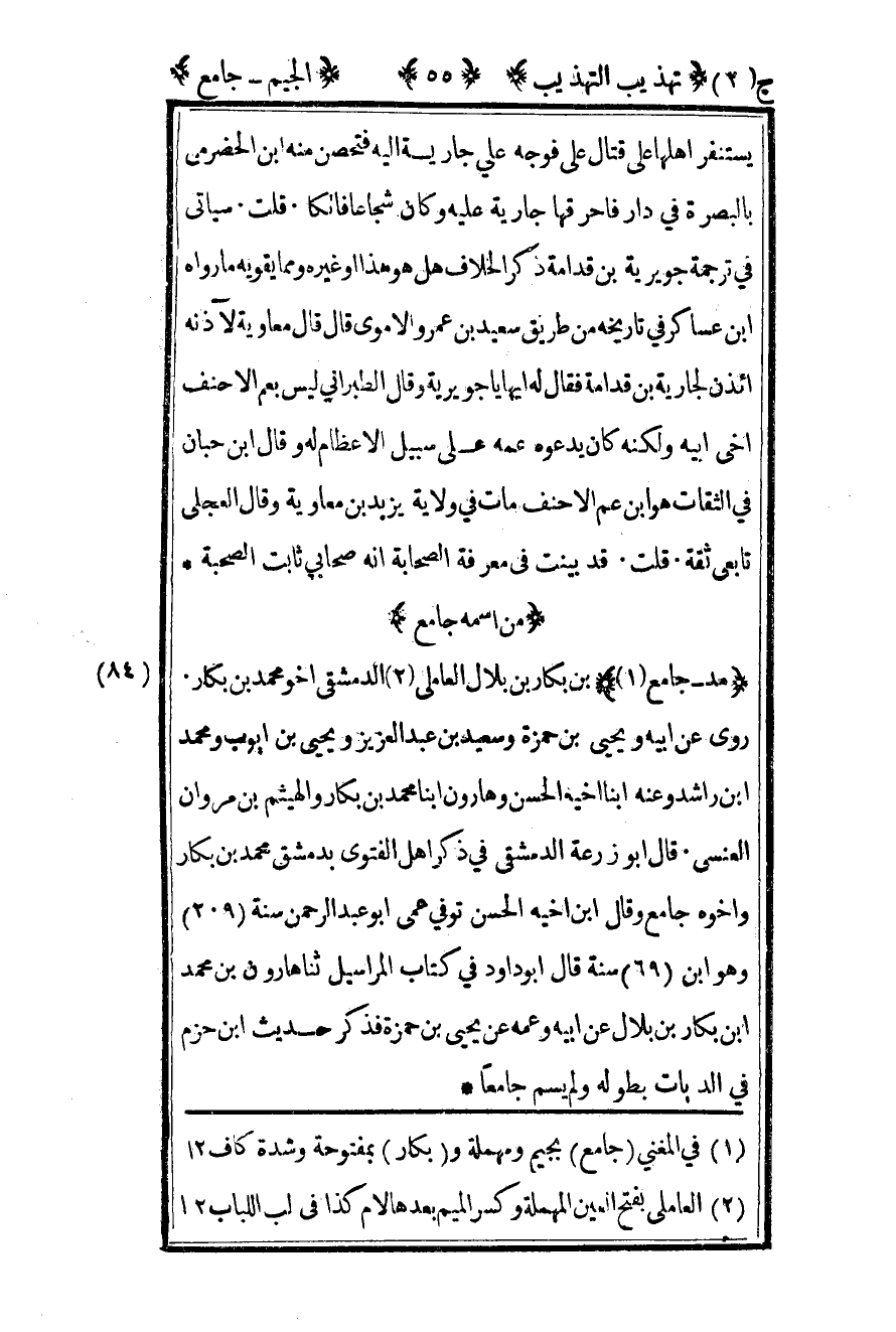 84- "مد – جامع1" بن بكار بن بلال العاملي2 الدمشقي أخو محمد بن بكار روى عن أبيه ويحيى بن حمزة وسعيد بن عبد العزيز ويحيى بن أيوب ومحمد بن راشد وعنه ابنا أخيه الحسن وهارون ابنا محمد بن بكار والهيثم بن مروان العنسي قال أبو زرعة الدمشقي في ذكر أهل الفتوى بدمشق محمد بن بكار وأخوه جامع وقال بن أخيه الحسن توفي عمي أبو عبد الرحمن سنة "209" وهو بن "69" سنة قال أبو داود في كتاب المراسيل ثنا هارون بن محمد بن بكار بن بلال عن أبيه وعمه عن يحيى بن حمزة فذكر حديث بن حزم في الديات بطوله ولم يسم جامعا.