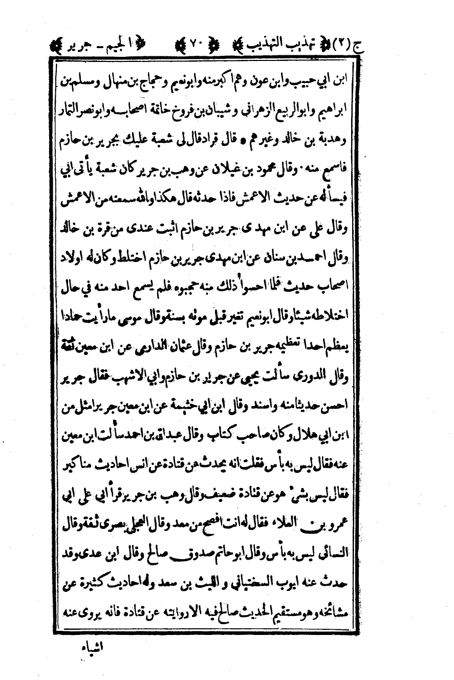 ابن أبي حبيب وابن عون وهم أكبر منه وأبو نعيم وحجاج بن منهال ومسلم بن إبراهيم وأبو الربيع الزهراني وشيبان بن فروخ خاتمة أصحابه وأبو نصر التمار وهدبة بن خالد وغيرهم قال قراد قال لي شعبة عليك بجرير بن حازم فأسمع منه وقال محمود بن غيلان عن وهب بن جرير كان شعبة يأتي أبي فيسأله عن حديث الأعمش فإذا حدثه قال هكذا والله سمعته من الأعمش وقال علي عن بن مهدي جرير بن حازم أثبت عندي من قرة بن خالد وقال أحمد بن سنان عن بن مهدي جرير بن حازم اختلط وكان له أولاد أصحاب حديث فلما احسوا ذلك منه حجبوه فلم يسمع أحد منه في حال اختلاطه شيئا وقال أبو نعيم تغير قبل موته بسنة وقال موسى ما رأيت حمادا يعظم أحدا تعظيمه جرير بن حازم وقال عثمان الدارمي عن بن معين ثقة وقال الدوري سألت يحيى عن جرير بن حازم وأبي الأشهب فقال جرير أحسن حديثا منه وأسند وقال بن أبي خيثمة عن بن معين جرير أمثل من بن هلال وكان صاحب كتاب وقال عبد الله بن أحمد سألت بن معين عنه فقال ليس به بأس فقلت إنه يحدث عن قتادة عن أنس أحاديث مناكير فقال ليس بشيء هو عن قتادة ضعيف وقال وهب بن جرير قرأ على أبي عمرو بن العلاء فقال له أفصح من معد وقال العجلي بصري ثقة وقال النسائي ليس به بأس وقال أبو حاتم صدوق صالح وقال بن عدي وقد حدث عنه أيوب السختياني والليث بن سعد وله أحاديث كثيرة عن مشائخه وهو مستقيم الحديث صالح فيه إلا روايته عن قتادة فإنه يروي عنه