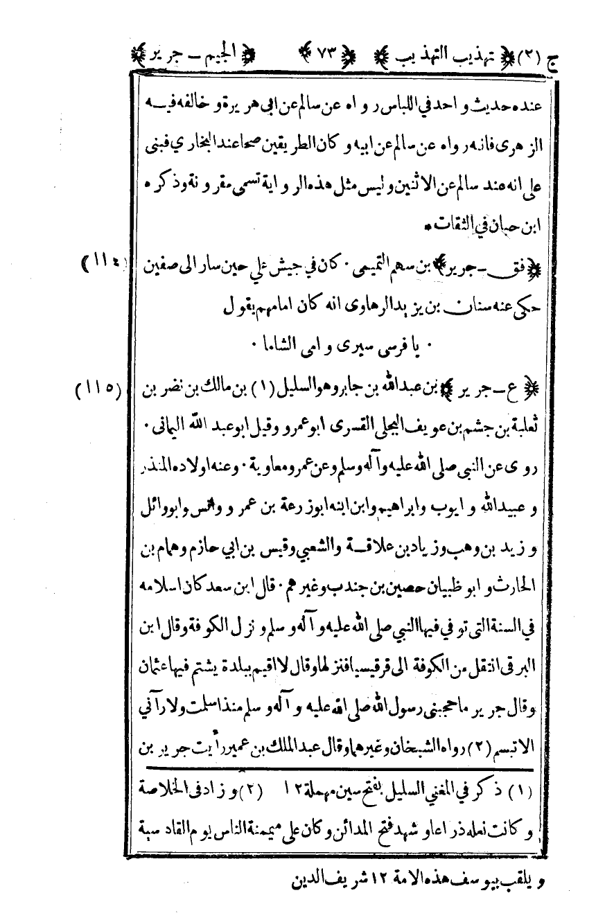 115- "ع – جرير" بن عبد الله بن جابر وهو السليل1 بن مالك بن نضر بن ثعلبة بن جشم بن عويف البجلي القسري أبو عمرو وقيل أبو عبد الله اليماني روى عن النبي صلى الله عليه وسلم وعن عمر ومعاوية وعنه أولاده المنذر وعبيد الله وأيوب وإبراهيم وابن ابنه أبو زرعة بن عمرو وأنس وأبو وائل وزيد بن وهب وزيادة بن علاقة والشعبي وقيس بن أبي حازم وهمام بن الحارث وأبو ظبيان حصين بن جندب وغيرهم قال بن سعد كان إسلامه في السنة التي توفي فيها النبي صلى الله عليه وسلم ونزل الكوفة وقال بن البرقي انتقل من الكوفة إلى قرقيسيا فنزلها وقال لا أقيم ببلدة يشتم فيها عثمان وقال جرير ما حجبني رسول الله صلى الله عليه وسلم منذ أسلمت ولا رآني إلا تبسم2 رواه الشيخان وغيرهما وقال عبد الملك بن عمير رأيت جرير بن