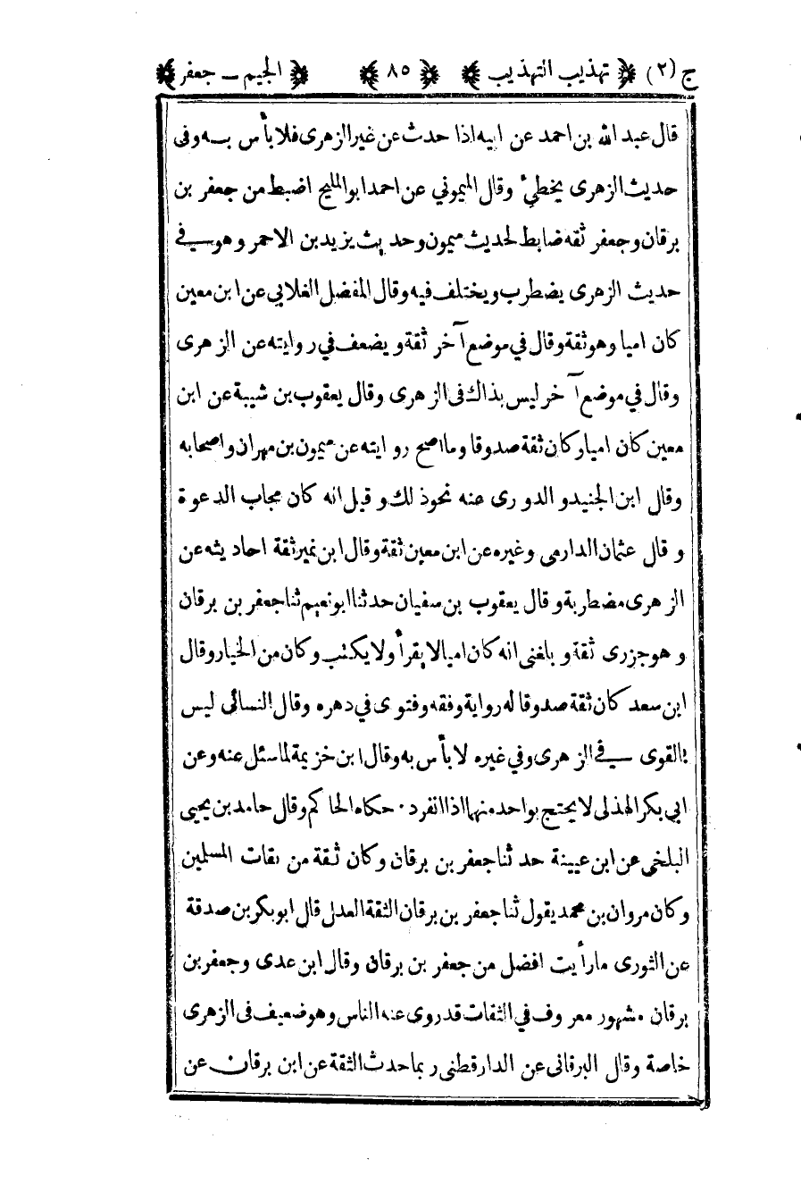 قال عبد الله بن أحمد عن أبيه إذا حدث عن غير الزهري فلا بأس به وفي حديث الزهري يخطىء وقال الميموني عن أحمد أبو المليح أضبط من جعفر بن برقان وجعفر ثقة ضابط لحديث ميمون وحديث يزيد بن الأحمر وهو في حديث الزهري يضطرب ويختلف فيه وقال المفضل الغلابي عن بن معين كان أميا وهو ثقة وقال في موضع آخر ثقة ويضعف في روايته عن الزهري وقال في موضع آخر ليس بذاك في الزهري وقال يعقوب بن شيبة عن بن معين كان أميا وكان ثقة صدوقا وما صح روايته عن ميمون بن مهران وأصحابه وقال بن الجنيد والدوري عنه نحو ذلك وقيل أنه مجاب الدعوة وقال عثمان الدارمي وغيره عن بن معين ثقة وقال بن نمير ثقة أحاديثه عن الزهري مضطربة وقال يعقوب بن سفيان حدثنا أبو نعيم ثنا جعفر بن برقان وهو جزري ثقة وبلغني أنه كان أميا لا يقرأ ولا يكتب وكان من الخيار وقال بن سعد كان ثقة صدوقا له رواية وفقه وفتوى في دهره وقال النسائي ليس بالقوي في الزهري وفي غيره لا بأس به وقال بن خزيمة لما سئل عنه وعن أبي بكر الهذلي لا يحتج بواحد منهما إذا انفرد حكاه الحاكم وقال حامد بن يحيى البلخي عن بن عيينة حدثنا جعفر بن برقان وكان ثقة من ثقات المسلمين وكان مروان بن محمد يقول ثنا جعفر بن برقان الثقة العدل قال أبو بكر بن صدقة عن الثوري ما رأيت أفضل من جعفر بن برقان وقال بن عدي وجعفر بن برقان مشهور معروف في الثقات قد روى عنه الناس وهو ضعيف في الزهري خاصة وقال البرقاني عن الدارقطني ربما حدث الثقة عن بن برقان عن