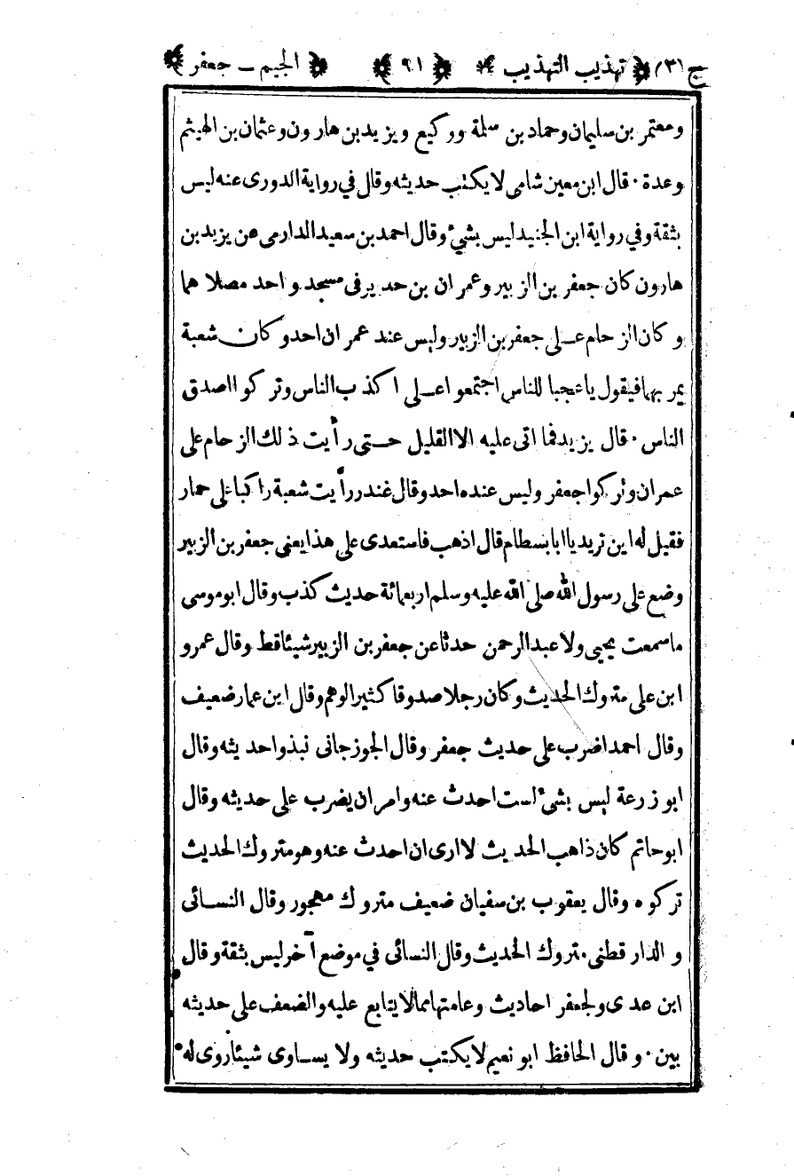 ومعتمر بن سليمان وحماد بن سلمة ووكيع ويزيد بن هارون وعثمان بن الهيثم وعدة قال بن معين شامي لا يكتب حديثه وقال في رواية الدوري عنه ليس بثقة وفي رواية بن الجنيد ليس بشيء وقال أحمد بن سعيد الدارمي عن يزيد بن هارون كان جعفر بن الزبير وعمران بن حدير في مسجد واحد مصلاهما وكان الزحام على جعفر بن الزبير وليس عند عمران أحد وكان شعبة يمر بهما فيقول يا عجبا للناس اجتمعوا على أكذب الناس وتركوا أصدق الناس قال يزيد فما أتى عليه الا القليل حتى رأيت ذلك الزحام على عمران وتركوا جعفر وليس عنده أحد وقال غندر رأيت شعبة راكبا على حمار فقيل له أين يزيد يا أبا بسطام قال اذهب فاستعدي على هذا يعني جعفر بن الزبير وضع على رسول الله صلى الله عليه وسلم أربعمائة حديث كذب وقال أبو موسى ما سمعت يحيى ولا عبد الرحمن حدثا عن جعفر بن الزبير شيئا قط وقال عمرو بن علي متروك الحديث وكان رجلا صدوقا كثير الوهم وقال بن عمار ضعيف وقال أحمد أضرب على حديث جعفر وقال الجوزجاني نبذوا حديثه وقال أبو زرعة ليس بشيء لست أحدث عنه وأمر أن يضرب على حديثه وقال أبو حاتم كان ذاهب الحديث لا أرى أن أحدث عنه وهو متروك الحديث تركوه وقال يعقوب بن سفيان ضعيف متروك مهجور وقال النسائي والدارقطني متروك الحديث وقال النسائي في موضع آخر ليس بثقة وقال بن عدي ولجعفر أحاديث وعامتها مما لا يتابع عليه والضعف على حديثه بين وقال الحافظ أبو نعيم لا يكتب حديثه ولا يساوي شيئا روى له.