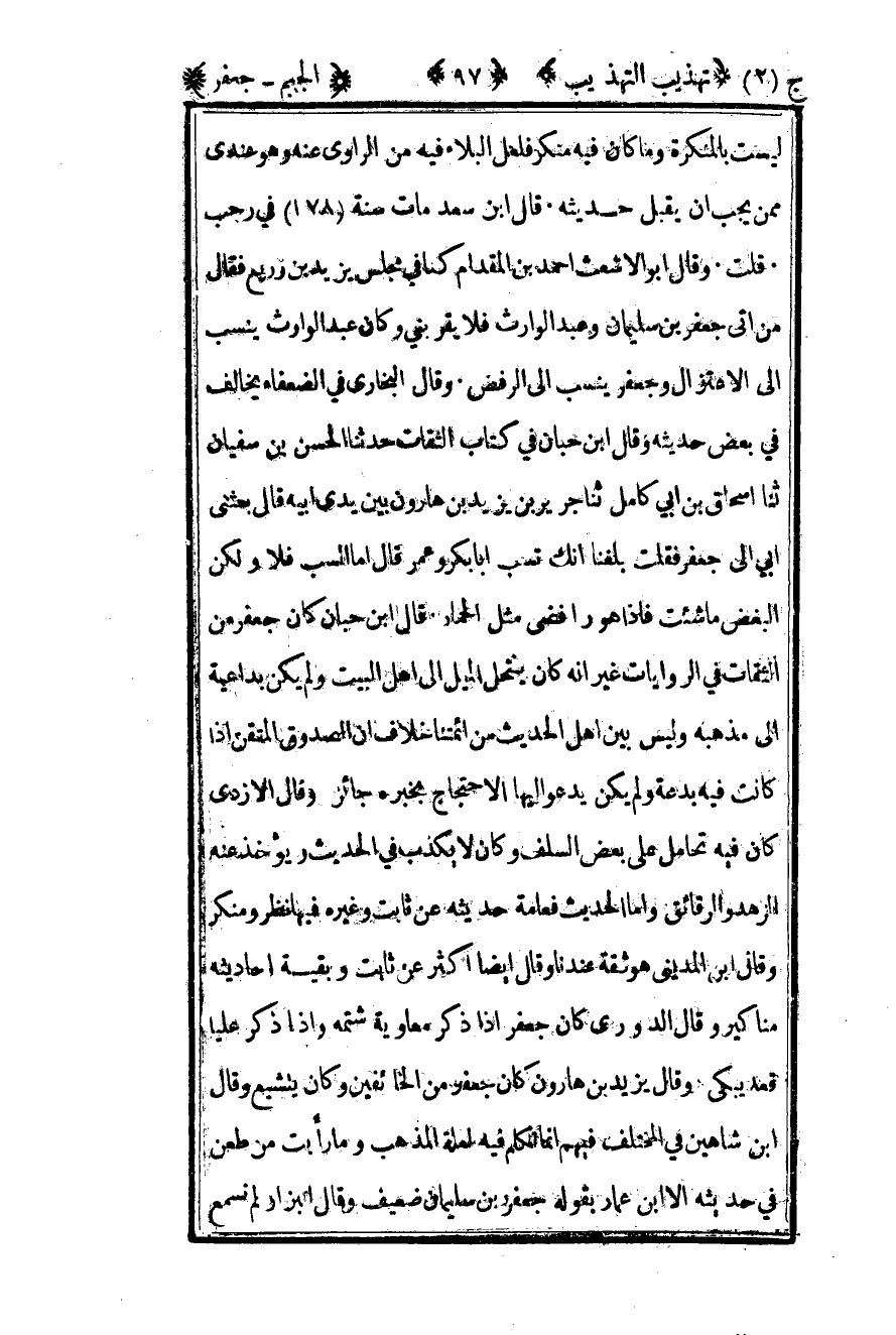 ليست بالمنكرة وما كان فيه منكر فلعل البلاء فيه من الراوي عنه وهو عندي ممن يجب أن يقبل حديثه قال بن سعد مات سنة "78" في رجب قلت وقال أبو الأشعث أحمد بن المقدام كنا في مجلس يزيد بن زريع فقال من أتى جعفر بن سليمان وعبد الوارث فلا يقربني وكان عبد الوارث ينسب إلى الاعتزال وجعفر ينسب إلى الرفض وقال البخاري في الضعفاء يخالف في بعض حديثه وقال بن حبان في كتاب الثقات حدثنا الحسن بن سفيان ثنا إسحاق بن أبي كامل ثنا جرير بن يزيد بن هارون بين يدي أبيه قال بعثني أبي إلى جعفر فقلت بلغنا انك تسب أبا بكر وعمر وقال أما السب فلا ولكن البغض ما شئت فإذا هو رافضي مثل الحمار قال بن حبان كان جعفر من الثقات في الروايات غير أنه ينتحل الميل إلى أهل البيت ولم يكن بداعية إلى مذهبه وليس بين أهل الحديث من أئمتنا خلاف أن الصدوق المتقن إذا كانت فيه بدعة ولم يكن يدعو إليها الاحتجاج بخبره جائز وقال الأزدي كان فيه تحامل على بعض السلف وكان لا يكذب في الحديث ويؤخذ عنه الزهد والرقائق وأما الحديث فعامة حديثه عن ثابت وغيره فيها نظر ومنكر وقال بن المديني هو ثقة عندنا وقال أيضا أكثر عن ثابت وبقية أحاديثه مناكير وقال الدوري كان جعفر إذا ذكر معاوية شتمه وإذا ذكر عليا قعد يبكي وقال يزيد بن هارون كان جعفر من الخائفين وكان يتشيع وقال بن شاهين في المختلف فيهم إنما تكلم فيه لعلة المذهب وما رأيت من طعن في حديثه إلا بن عمار بقوله جعفر بن سليمان ضعيف وقال البزار لم نسمع