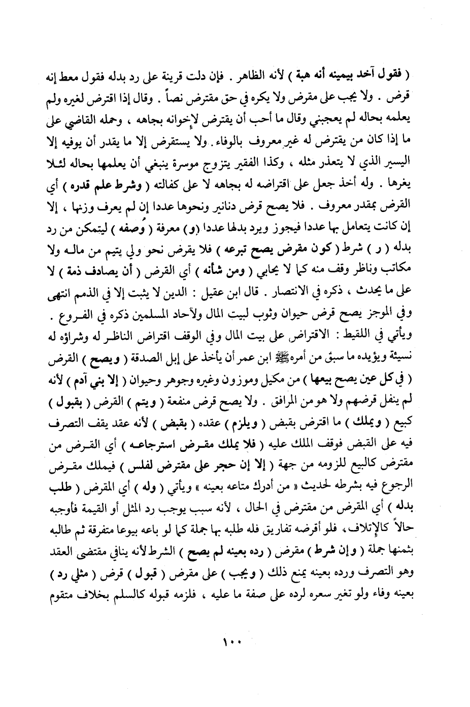 (كَوْنُ مُقْرِضٍ يَصِحُّ تَبَرُّعُهُ) فَلَا يُقْرِضُ نَحْوُ وَلِيِّ يَتِيمٍ مِنْ مَالِهِ وَلَا مُكَاتَبٍ وَنَاظِرِ وَقْفٍ مِنْهُ كَمَا لَا يُحَابِي (وَمِنْ شَأْنِهِ) أَيْ الْقَرْضِ (أَنْ يُصَادِفَ ذِمَّةً) لَا عَلَى مَا يَحْدُثُ، ذَكَرَهُ فِي الِانْتِصَارِ.