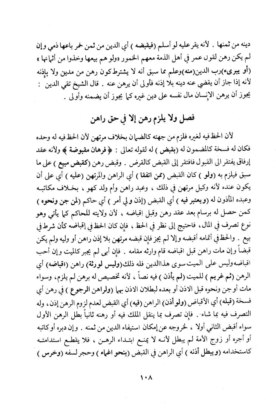 دَيْنِهِ مِنْ ثَمَنِهَا ; لِأَنَّهُ يُقَرُّ عَلَيْهِ لَوْ أَسْلَمَ (فَيَقْبِضُهُ) أَيْ: الدَّيْنَ مِنْ ثَمَنِ خَمْرٍ بَاعَهَا ذِمِّيٌّ وَإِنْ لَمْ يَكُنْ رَهْنٌ لِقَوْلِ عُمَرَ فِي أَهْلِ الذِّمَّةِ مَعَهُمْ الْخُمُورُ " وَلُّوهُمْ بَيْعَهَا وَخُذُوا مِنْ أَثْمَانِهَا " (أَوْ يُبْرِئُ) رَبُّ الدَّيْنِ (مِنْهُ) وَعُلِمَ مِمَّا سَبَقَ أَنَّهُ لَا يُشْتَرَطُ كَوْنُ رَهْنٍ مِنْ مَدِينٍ وَلَا بِإِذْنِهِ ; لِأَنَّهُ إذَا جَازَ أَنْ يَقْضِيَ عَنْهُ دَيْنَهُ بِلَا إذْنِهِ فَأَوْلَى أَنْ يَرْهَنَ عَنْهُ قَالَ الشَّيْخُ تَقِيُّ الدِّينِ: يَجُوزُ أَنْ يَرْهَنَ الْإِنْسَانُ مَالَ نَفْسِهِ عَلَى دَيْنِ غَيْرِهِ كَمَا يَجُوزُ أَنْ يَضْمَنَهُ وَأَوْلَى.
