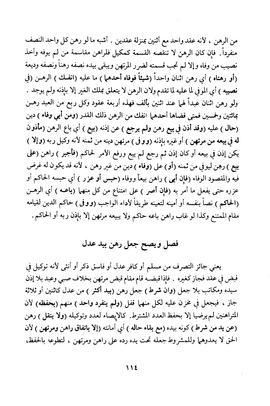 مِنْ الرَّهْنِ ; لِأَنَّهُ عَقْدٌ وَاحِدٌ مَعَ اثْنَيْنِ بِمَنْزِلَةِ عَقْدَيْنِ أَشْبَهَ مَا لَوْ رَهَنَ كُلُّ وَاحِدٍ النِّصْفَ مُنْفَرِدًا فَإِنْ كَانَ الرَّهْنُ لَا تُنْقِصُهُ الْقِسْمَةُ كَمَكِيلٍ فَلِرَاهِنٍ مُقَاسَمَةُ مَنْ لَمْ يُوَفِّهِ وَأَخَذُ نَصِيبِ مَنْ وَفَّاهُ وَإِلَّا لَمْ تَجِبْ قِسْمَتُهُ لِضَرَرِ الْمُرْتَهِنِ وَيَبْقَى بِيَدِهِ نِصْفُهُ رَهْنًا وَنِصْفُهُ وَدِيعَةً