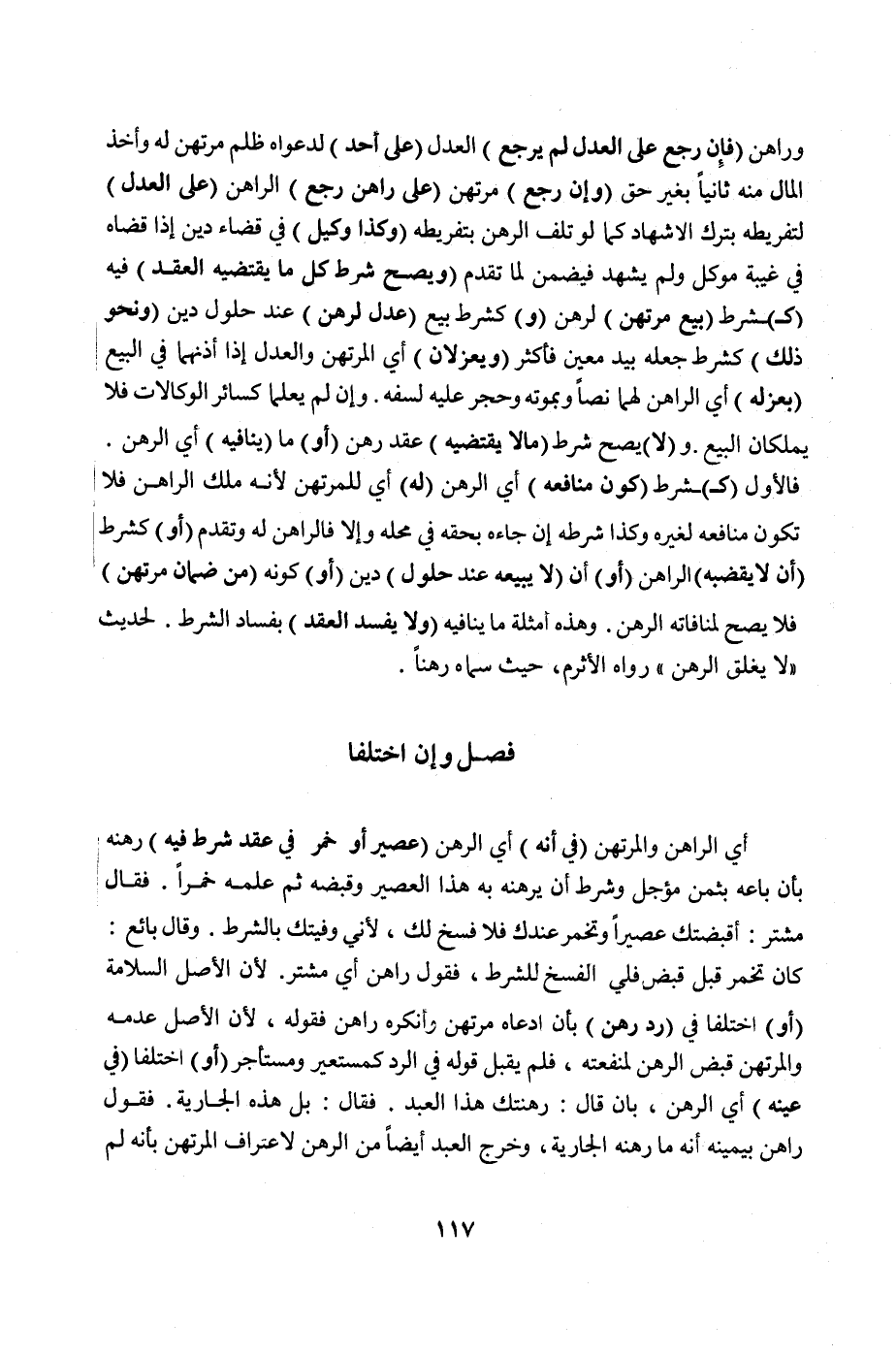 فَصْلٌ وَإِنْ اخْتَلَفَا أَيْ الرَّاهِنُ وَالْمُرْتَهِنُ (فِي أَنَّهُ) أَيْ الرَّهْنَ (عَصِيرٌ أَوْ خَمْرٌ فِي عَقْدٍ شُرِطَ فِيهِ) رَهْنُهُ بِأَنْ بَاعَهُ بِثَمَنٍ مُؤَجَّلٍ وَشَرَطَ أَنْ يَرْهَنَهُ بِهِ هَذَا الْعَصِيرَ وَقَبَضَهُ ثُمَّ عَلِمَهُ خَمْرًا فَقَالَ مُشْتَرٍ: أَقَبَضْتُكَ عَصِيرًا وَتَخَمَّرَ عِنْدَك فَلَا فَسْخَ لَك، لِأَنِّي وَفَّيْتُكَ بِالشَّرْطِ وَقَالَ بَائِعٌ: كَانَ تَخَمَّرَ قَبْلَ قَبْضٍ فَلِي الْفَسْخُ لِلشَّرْطِ، فَقَوْلُ رَاهِنٍ أَيْ مُشْتَرٍ ; لِأَنَّ الْأَصْلَ السَّلَامَةُ
